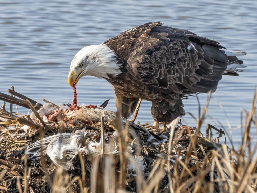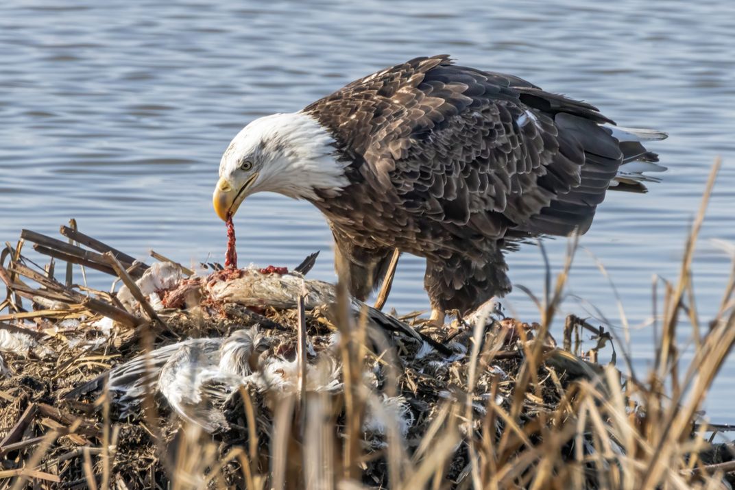 A bald eagle eating a dead bird.