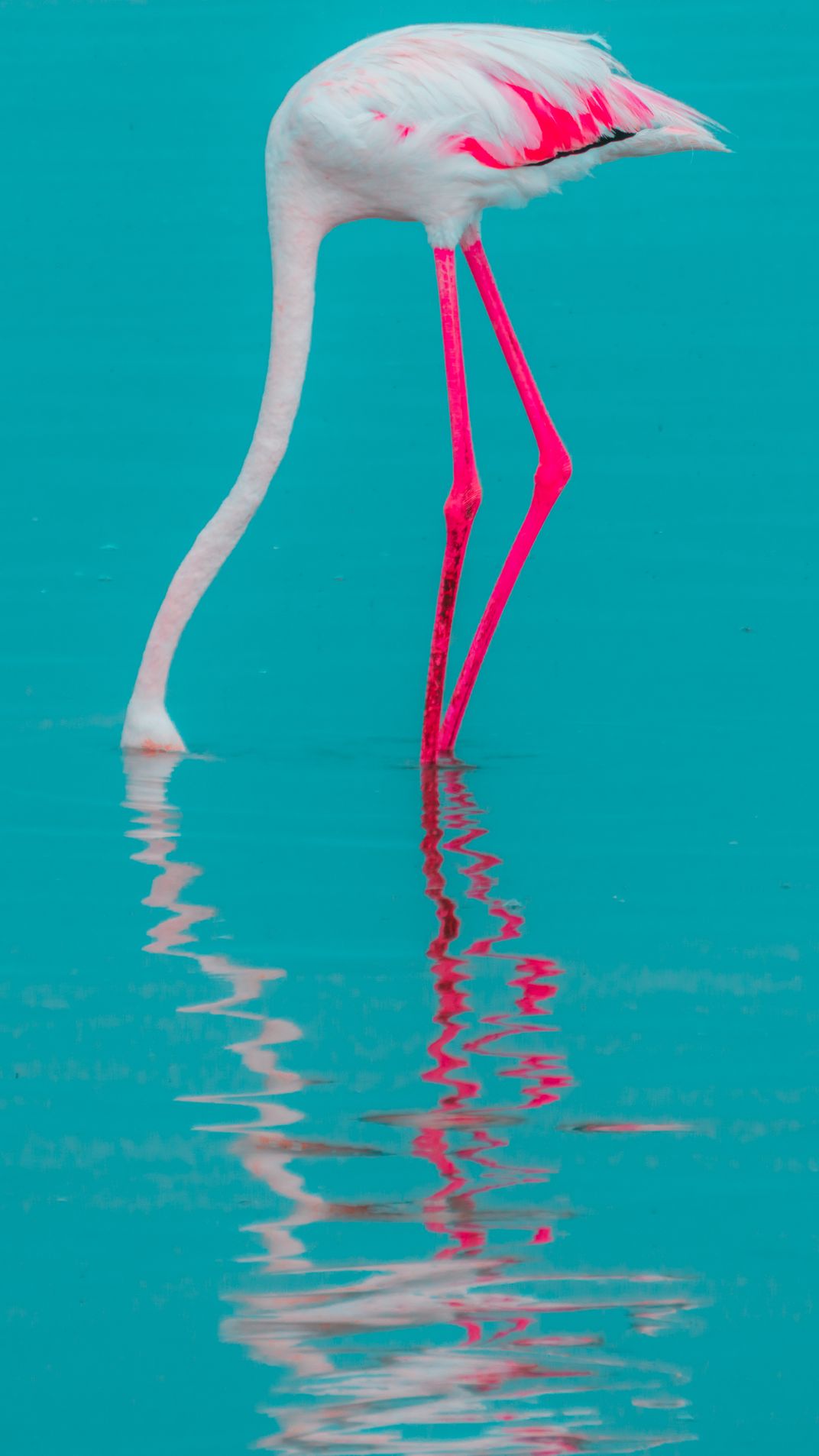 The photo depicts an eating flamingo and its reflection on the water right next to the Namibian beach near Walvis Bay.