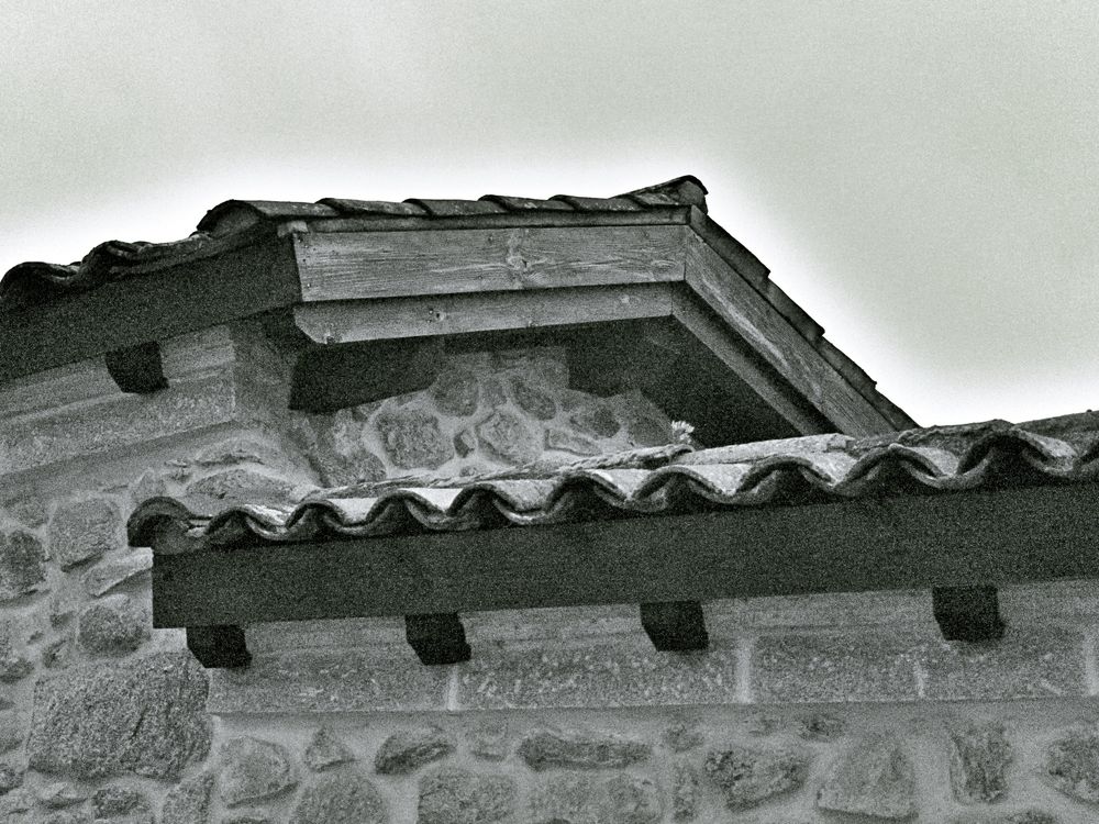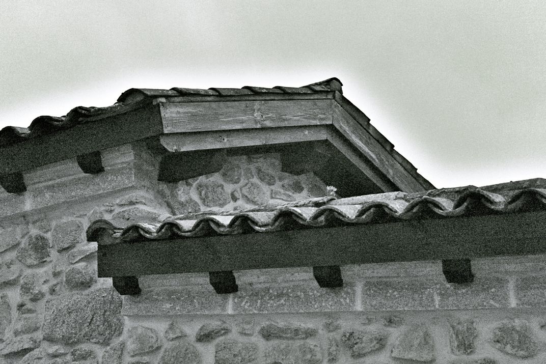 The pine wood eaves of two 19th-century stone houses in Navacerrada stand weathered but resilient. Captured under a soft, cloudy sky in black and white, the digital grain adds texture to this study of rural architecture's quiet endurance.