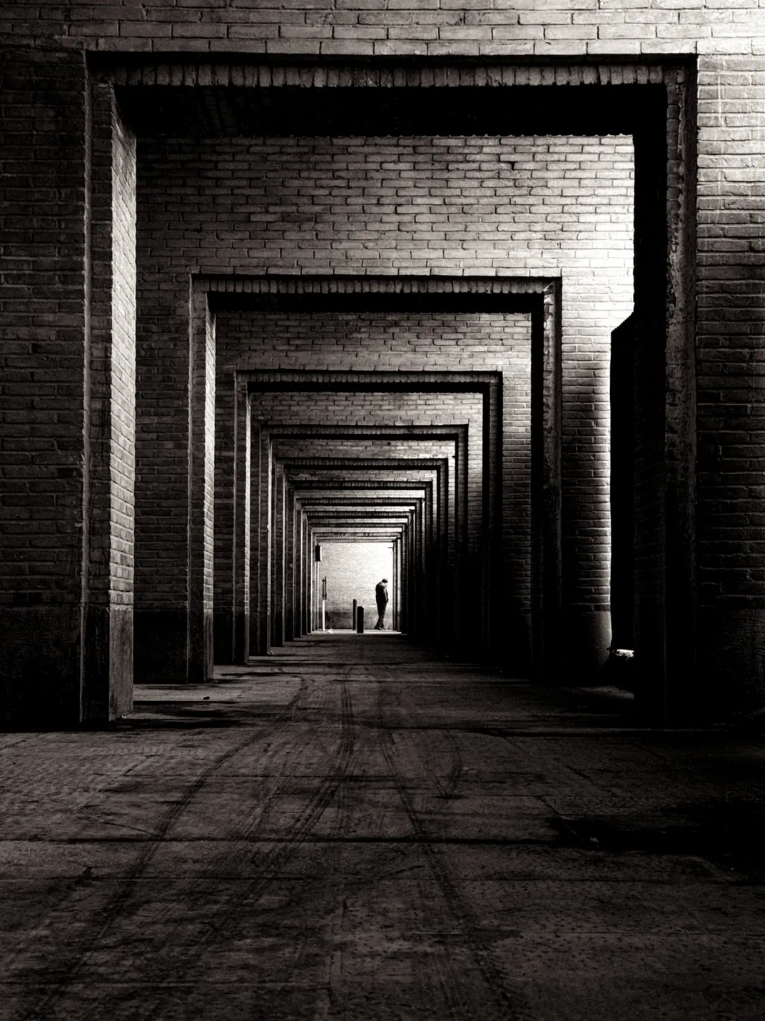 A lone figure stands framed by endless brick arches, where light and shadow weave a quiet rhythm. The geometry draws the eye inward, capturing the stillness of time within Isfahan’s timeless architecture.
