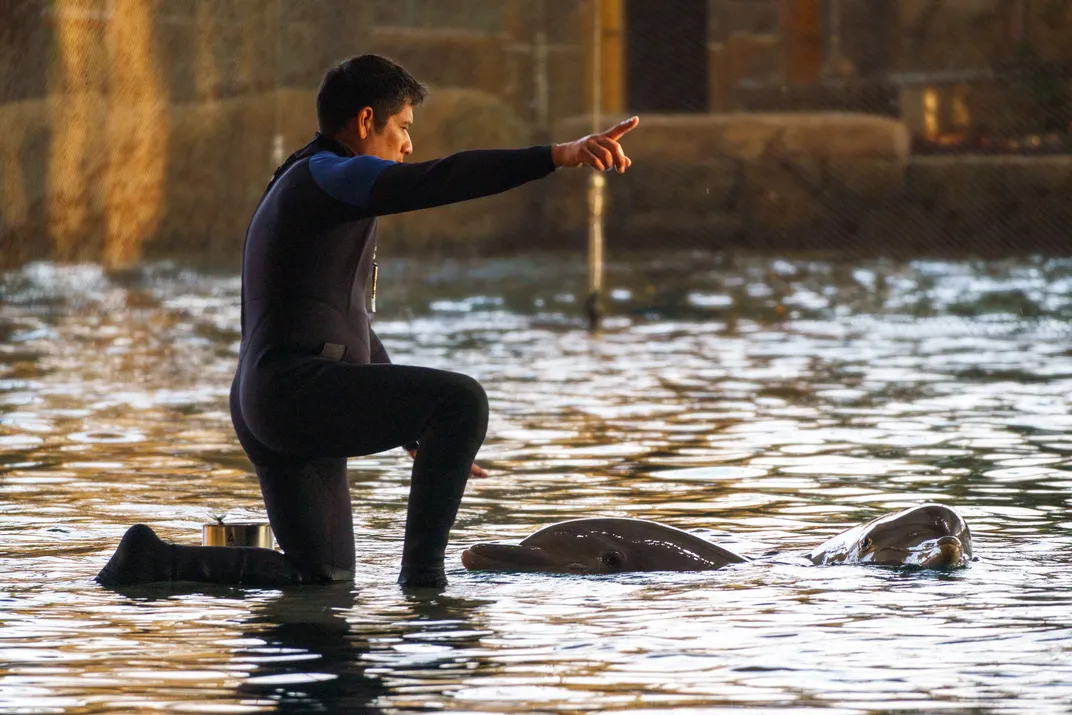 A fleeting moment of trust and connection — the dolphin rises from the blue, meeting the trainer’s outstretched hand in perfect synchronization. Captured within the vast, softly illuminated space of SeaWorld Abu Dhabi, the image reflects more than a performance; it reveals a shared language between species built on rhythm, respect, and play. The glistening water mirrors their movement, turning the scene into a quiet dance between human and ocean life.