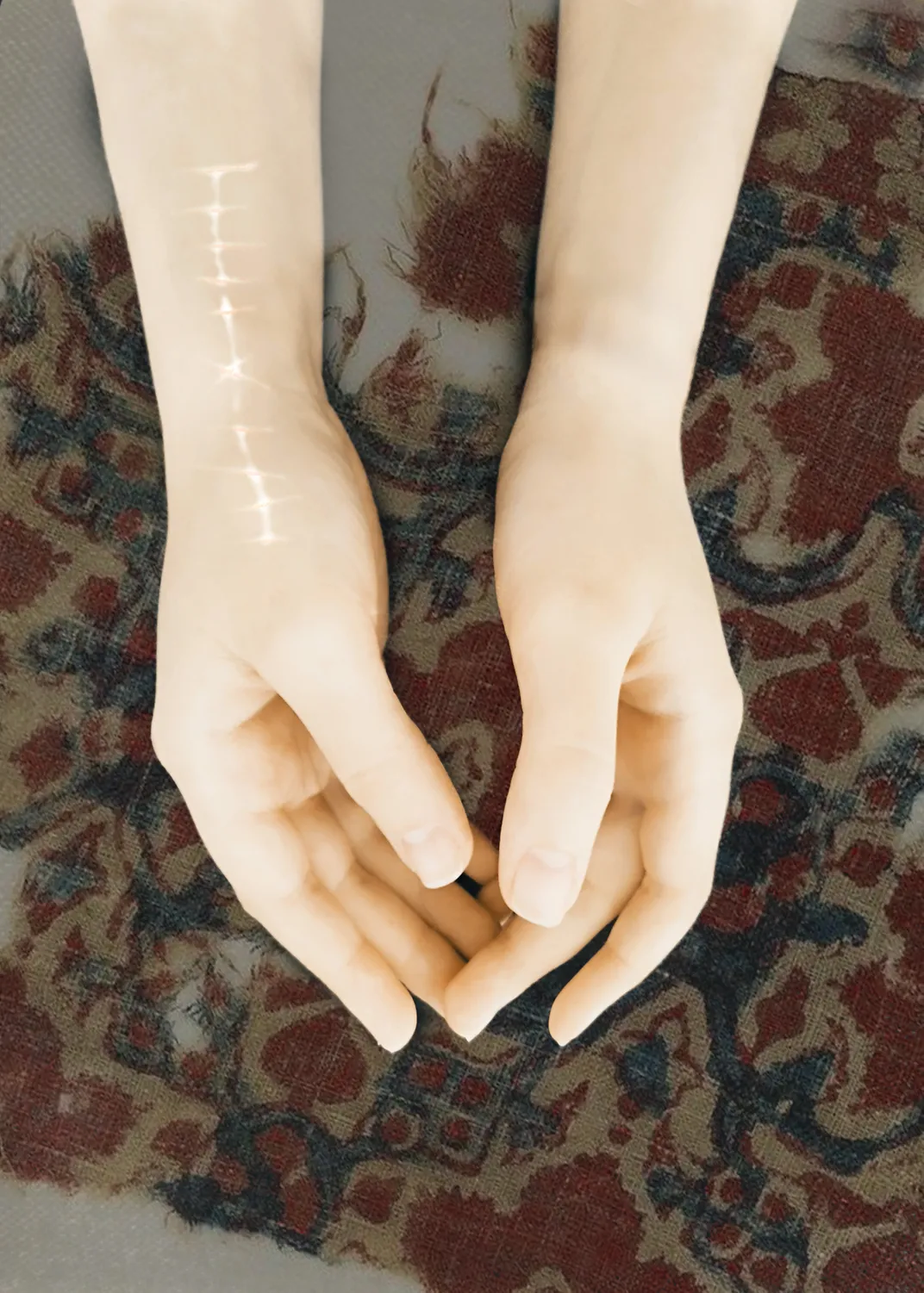 Hands with a history of life. They are drained of blood. The blood is not bright, it's dried, and the wound is stitched. This means the circulatory system is working, there's a pulse... life goes on, no matter what!