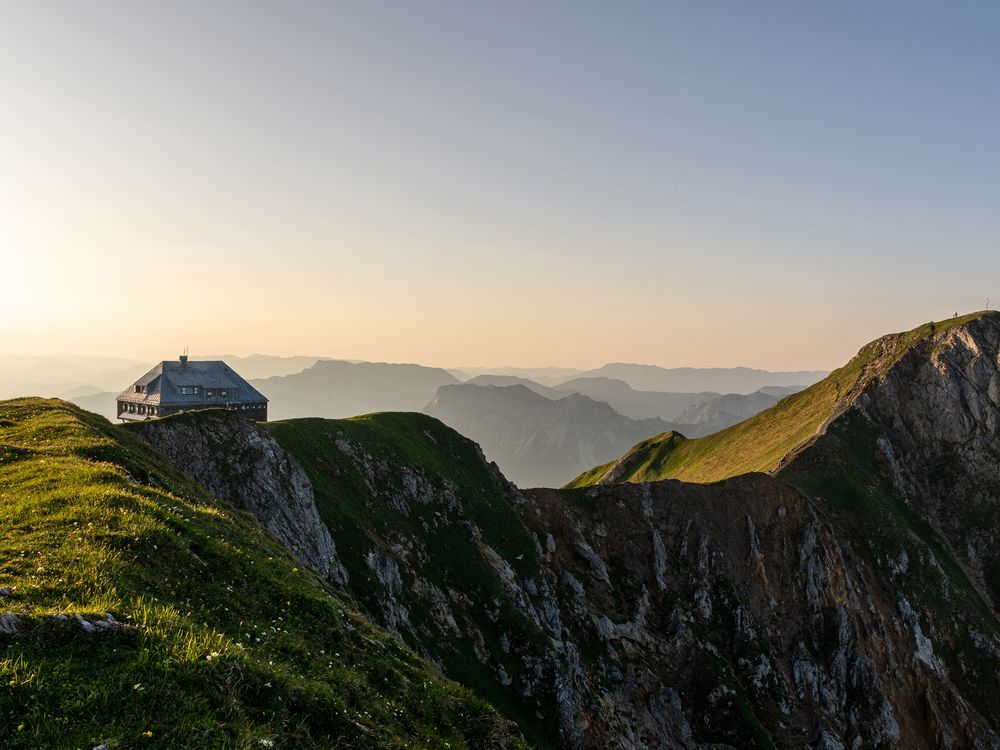 Perched on the brink of a dramatic alpine ridge, this solitary mountain hut stands bathed in the soft golden light of sunset. Captured in the remote highlands, the image conveys a sense of isolation, tranquility, and the vast majesty of nature, where human presence feels both humble and harmonious within the grand design of the mountains.