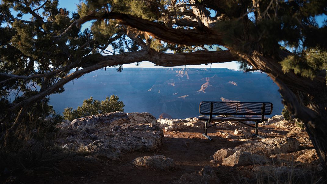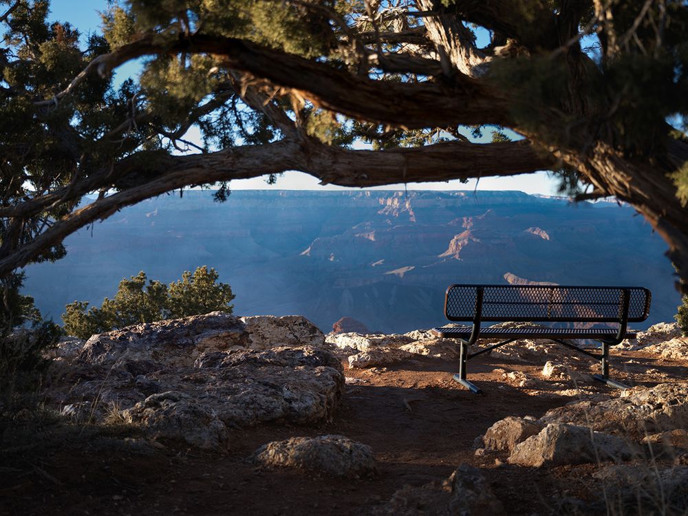 An empty bench faces the vast canyon, framed by twisted branches. Soft light spills over the rim, turning shadow into depth. In this quiet moment, the scene holds a sense of waiting—where absence meets the open horizon.
