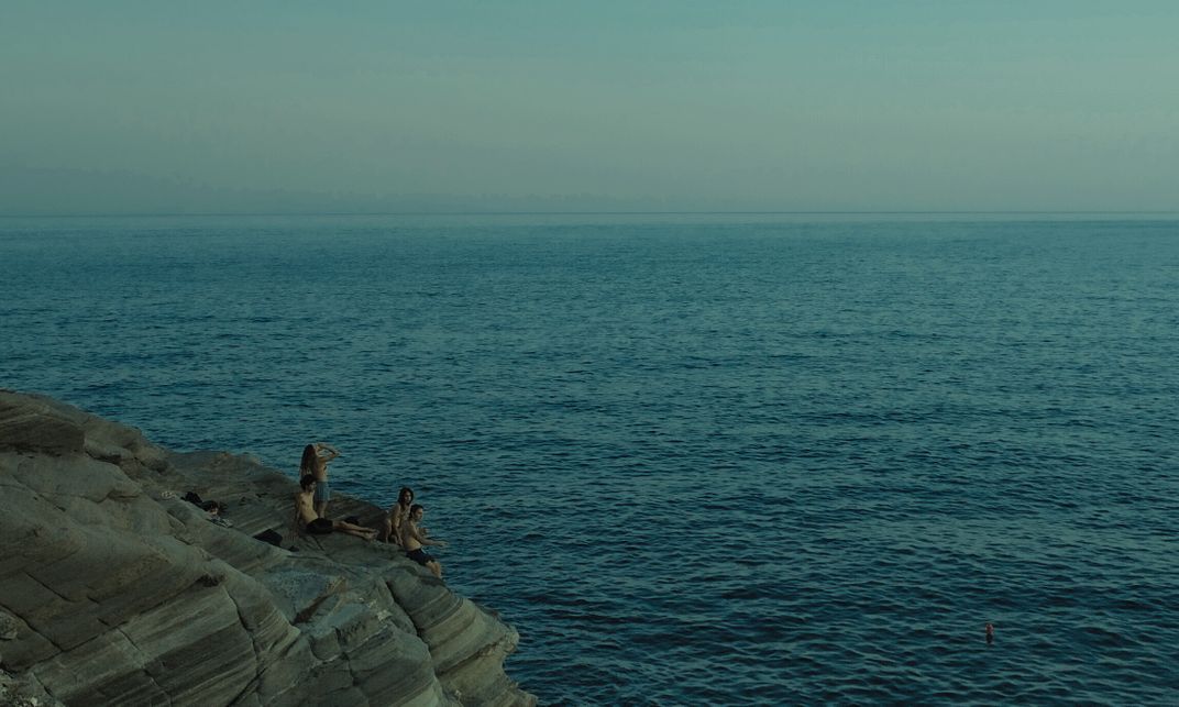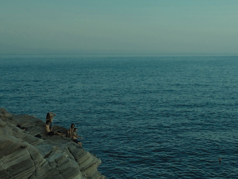 A group of friends sits on layered rocks above the sea, pausing between sunlight and deep blue water as the horizon dissolves into haze.