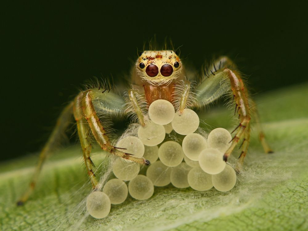 Two-striped jumper, or Telamonia dimidiata, is a jumping spider found in various Asian tropical rain forests. This photo a female two-striped jumper eating eggs of other jumping spider. This is a rare moment in jumping spider worlds. Female spider needs more protein rather then male spider because they produce eggs for Breeding. This why female jumper always ready to accept easy food. This photo was the rarest example of egg eating strategy of female jumping spider.