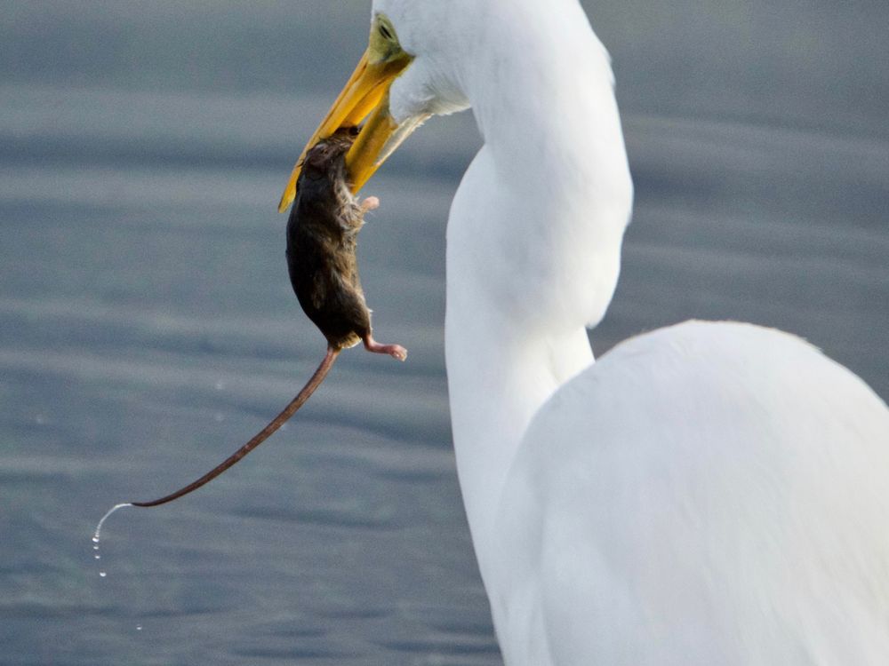 watched this egret fixate on a mouse hole, then pounce and grab. Then it drowned the mouse before ingestion.