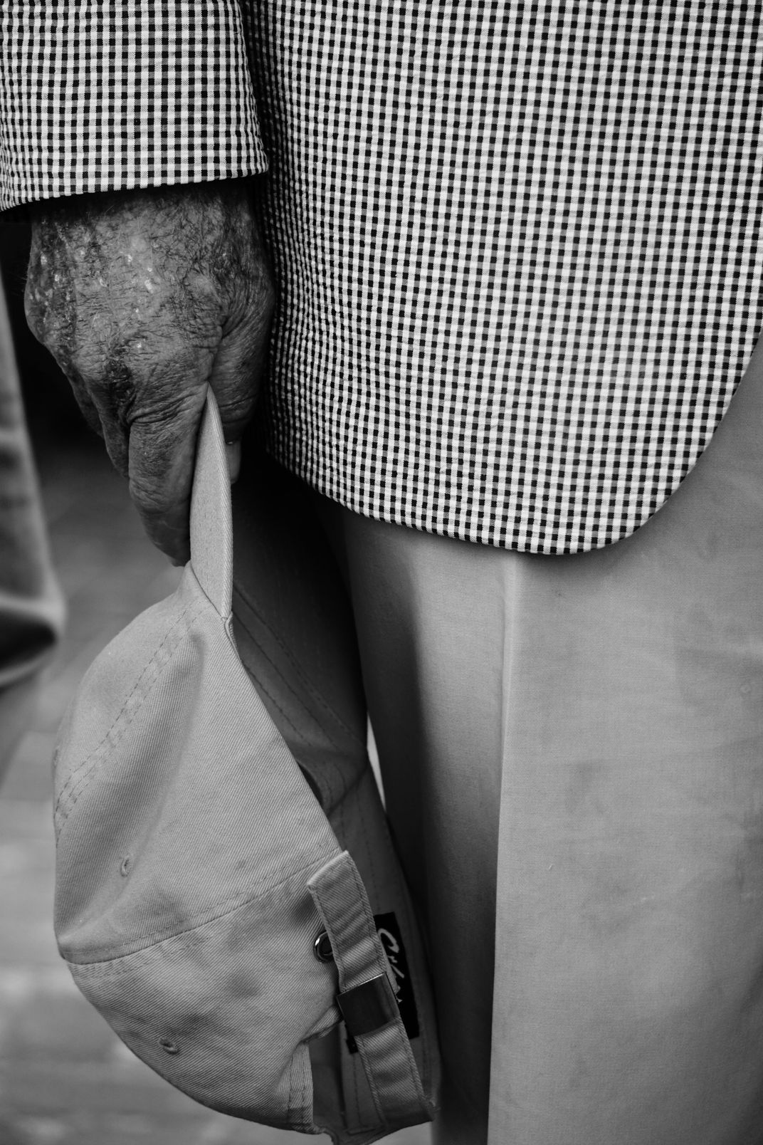 An elderly man stands in line, waiting for his turn to tour a French ship. No face is needed to determine his age. His hand shows his age and how his thin skin causes bruising. But, it is the baseball cap that he holds in his hand that tells me that his body may have aged, but his mind has not.