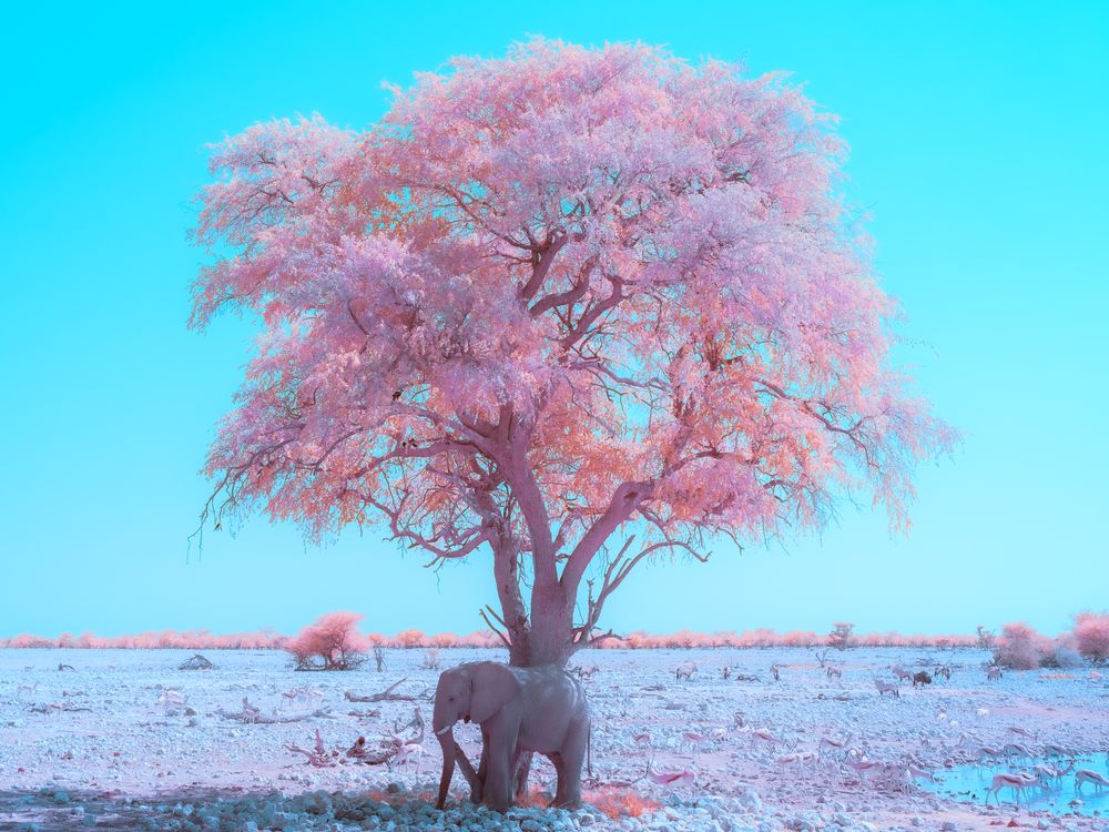 This infrared 550nm image captures a strikingly surreal scene at a waterhole in Etosha National Park, Namibia. At the center is a large tree rendered in vibrant pink tones, under which an elephant takes refuge from the sun. The surrounding landscape reveals a gathering of wildlife, including antelope species such as springboks and oryx, all drawn to the waterhole. Infrared photography transforms this arid African environment into a dreamlike tableau, highlighting the interplay between life and the harsh terrain of Etosha.