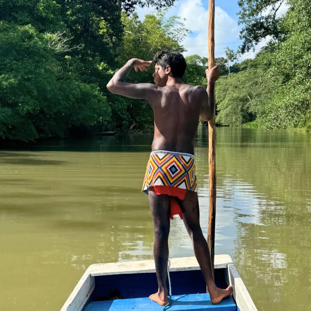 An Emberá guide stands tall at the front of a dugout canoe, paddle in hand, as he navigates the calm waters of Panama’s Chagres River. Dressed in traditional woven cloth patterned with vivid geometric designs, he surveys the jungle ahead, framed by thick walls of green. The scene embodies quiet strength and a deep connection to the land and water that sustain his community.