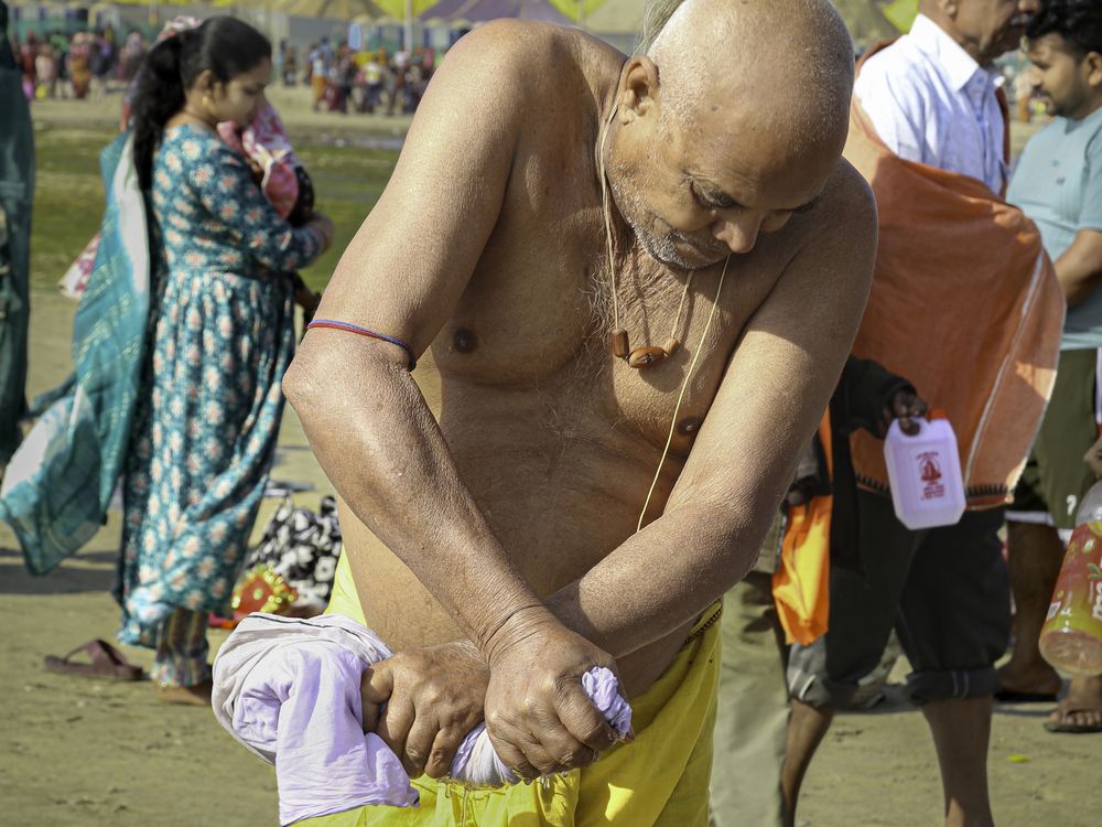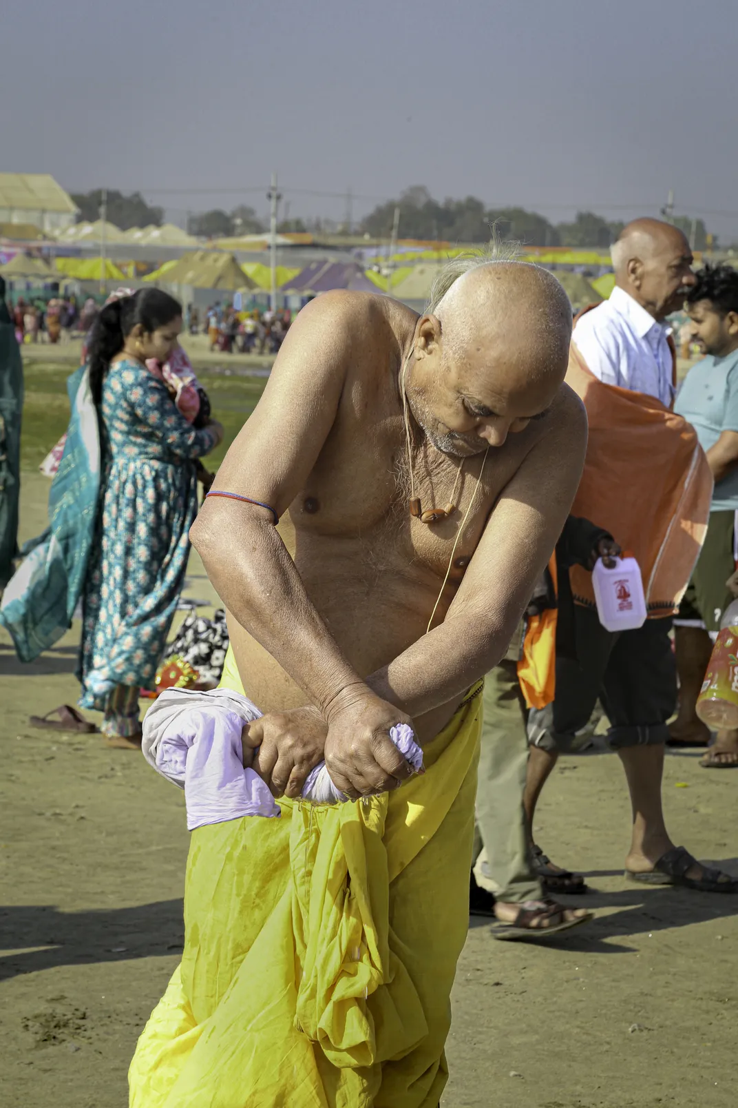 After the ritual bath, a pilgrim wraps himself in yellow cloth, his expression filled with peace. In this moment of cleansing, devotion transforms into serene grace.
