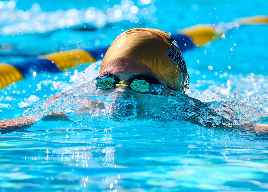 Swimmer competing in the breaststroke coming out of the water for a breath.