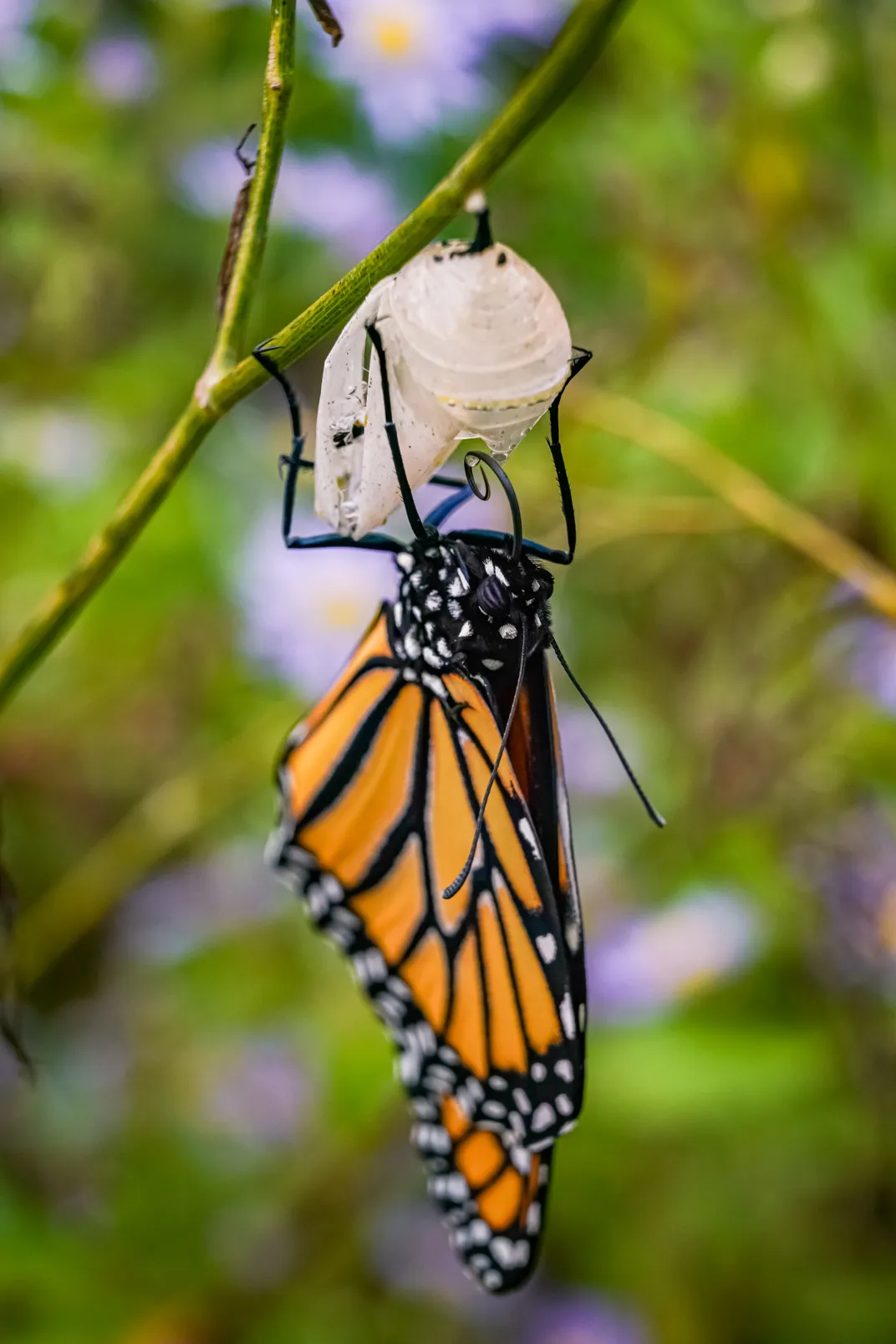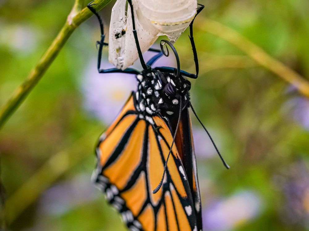 A beautiful female monarch butterfly emerges from her chrysalis amidst the fennel brush.