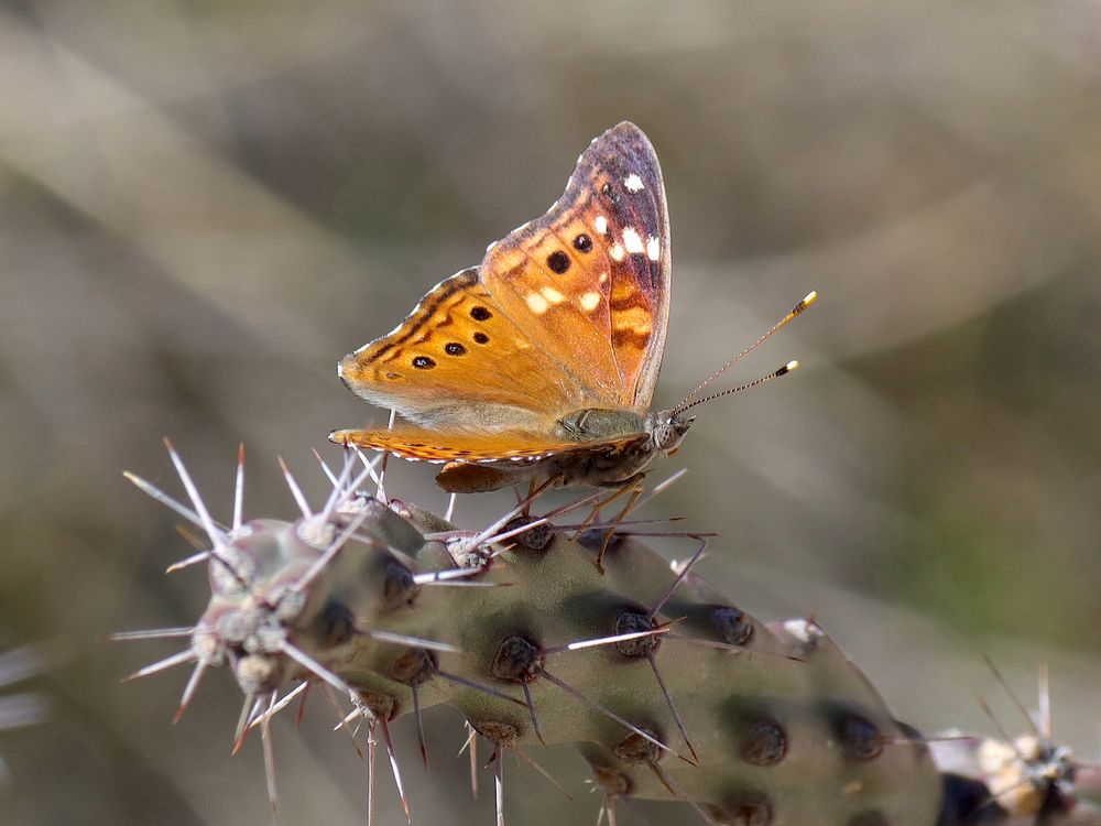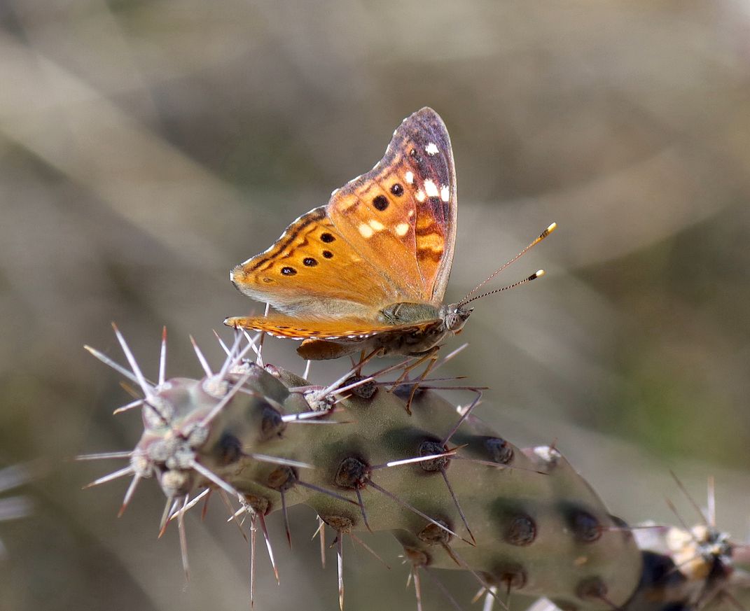 Empress Leilia Butterflies patrol open paths in the Sonoran Desert when looking for mates. The Staghorn Cholla wasn't in bloom and it isn't the butterfly's host plant (which is Desert Hackberry), but provided a safe haven to perch for few minutes.