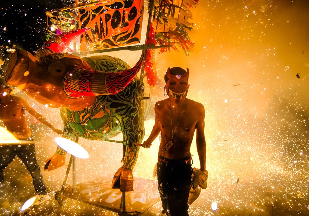 Encuentro con el diablo De una enorme y estruendosa explosión emerge Amapolo una bestia furiosa con cuernos que expulsa una lluvia de chispas y fuego sobre todo lo que está a su paso. Un diablo de cara roja con grandes colmillos y sonrisa burlona me mira de frente mientras que la lluvia de chispas cae sobre su espalda, paso a paso va avanzando desatando el infierno sobre todo lo que esta a su paso y es ais como este jóven guerrero del fuego completa su ofrenda de fuego y sangre en honor al santo patrono San Juan de Dios y el antiguo dios ancestral del fuego Huehueteotl.