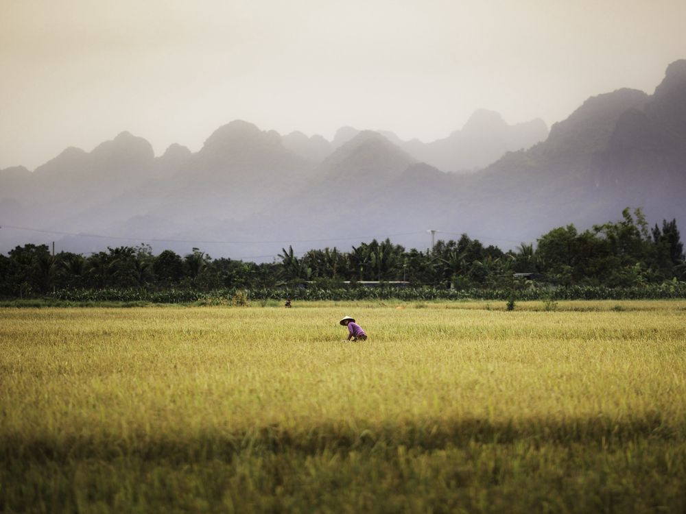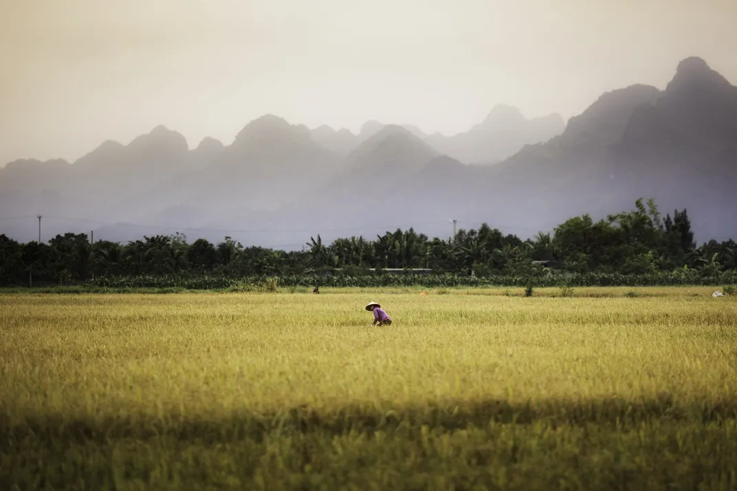 Golden rice fields near Hoa Lu as workers finish the final steps of the harvest. Calm light settling over the landscape capturing a brief moment of quiet before the season ends.