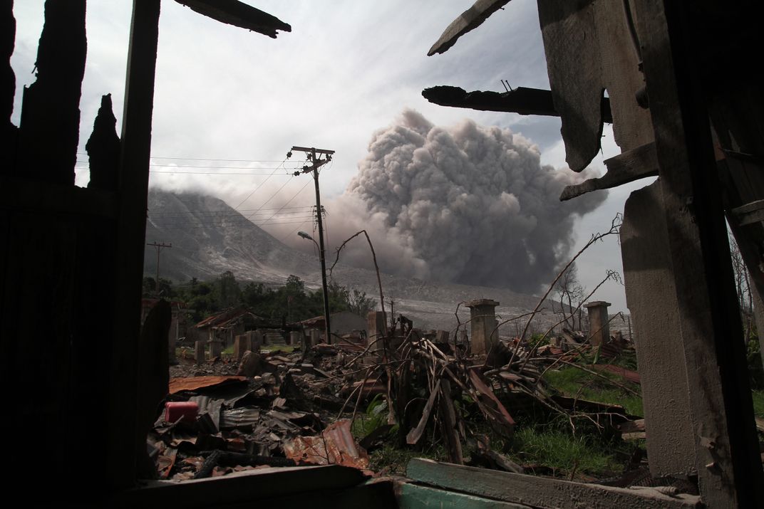 Mount Sinabung erupted after viewing area in the left (red-zone) is Thunder Kinayan village, Karo, North Sumatra, Indonesia on 22 Juny 2015. Visible pieces of the damaged section house where the impact of the volcanic eruption Sinabung burn.
