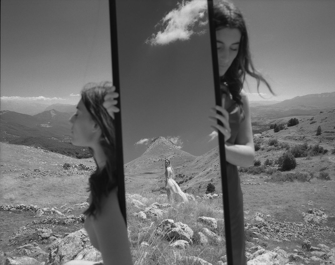 Using film photography with no digital manipulation I pose women in the landscape. By using mirrors, reflections, and forced perspective, I create an illusion in front of the lens. Although they misleadingly appear docile, it is obvious they possess a mysterious power to move the landscape at will. They change shape and scale, picking up parts of the landscape or completely transforming it.