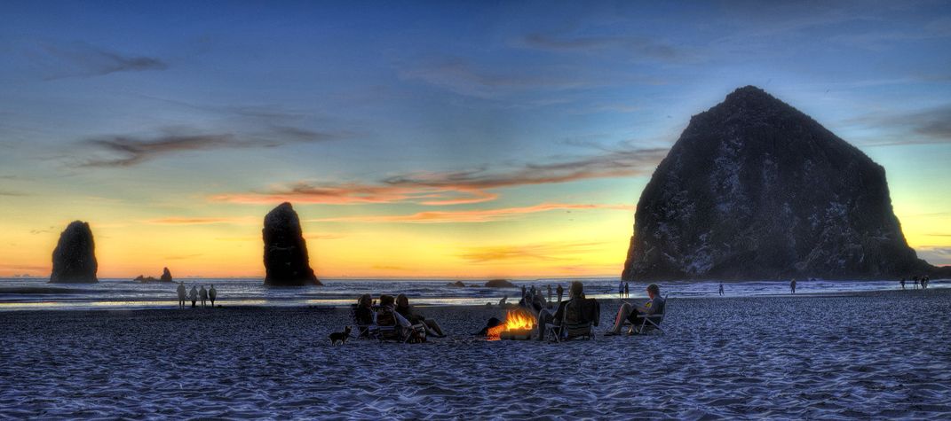 A bonfire on the beach at Cannon Beach, Oregon at sunset with Haystack Rock and the Needles in the background