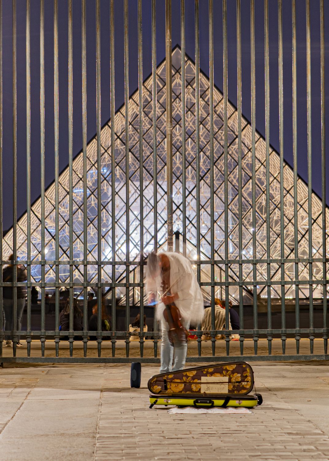 I tried to create this blury musician effect as this place (le Louvre) is a temple of the Time, because of the history of the place, the futuristic Pyramid, the present time of this music and violin. When you ear music, you listen the present note, wait the next one and remember the last one.