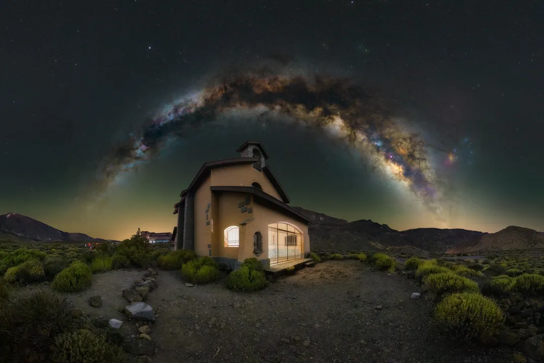 A lone chapel glows softly against Tenerife's rugged, barren landscape, embraced by the vast, star-filled night. Above, the Milky Way arcs brilliantly across the sky, its faint light casting gentle shadows.