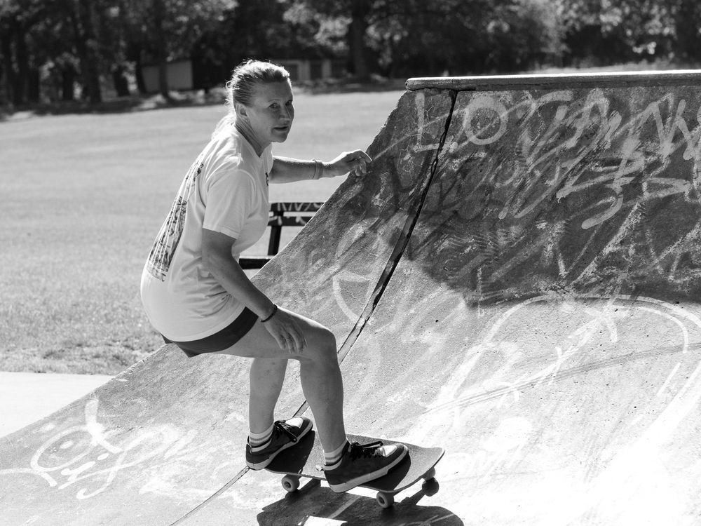 Esther is an artist and lecturer whose research focus is exploring the embodied learning experiences of women in skateboarding through understanding challenge, risk and success. I have known her for over 50 years and was very happy to capture her skateboarding in a park we often visited as kids.