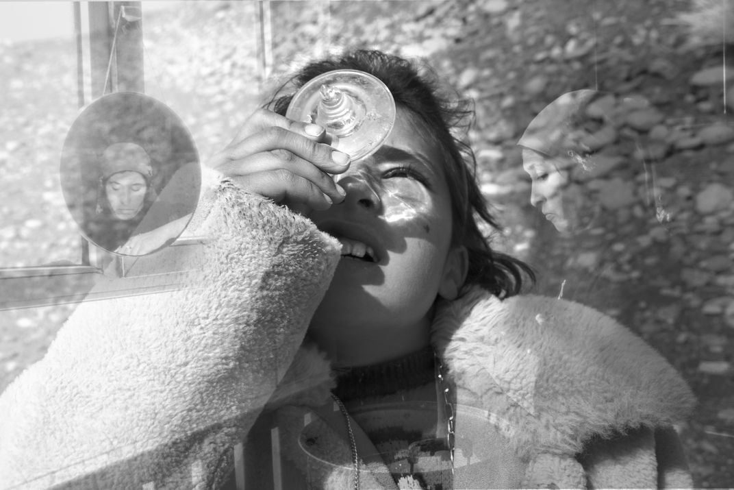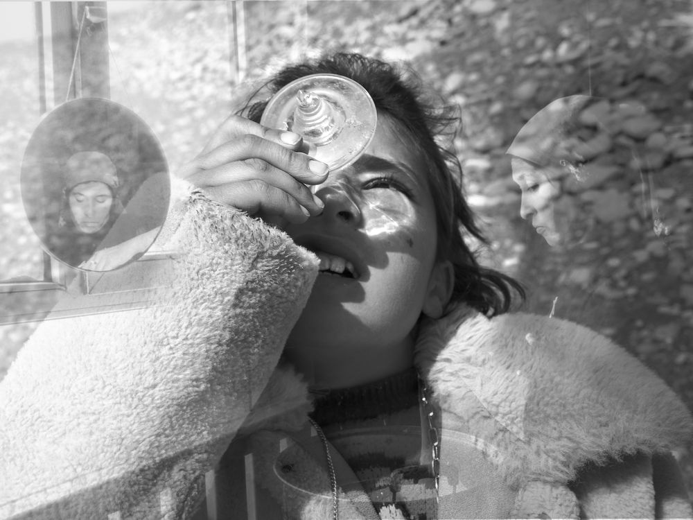 Guli discovered the secret of light three years ago while being punished to stand. She was staring at a photo of her parents pressed under a piece of glass. The sunlight on the plateau and the reflection from the snow made the photo dazzlingly bright. She stared at the photo in a daze, and after an unknown length of time, she closed her eyes, only to be amazed to find that the image of the photo was imprinted in her vision. It became more apparent when she faced the sunshine, though it would fade after about a week. She began using shards of glass she found while herding to enhance the imprint of the photo.She has been doing this for a year, and now the image can last for a full month without fading. I photographed the image already imprinted in her eyes and superimposed it above, hoping viewers could also see the vision she longs to behold every time she closes them. In an era of rapid technological and military advancement, what is happening here represents a kind of "regressive evolution" of technology. The children's method is essentially a reversion to the origins of photography, using optics to fix images. This forces us to reflect: in extreme environments, what constitutes technology? Whose technology counts? And what have we sacrificed in the name of so-called progress?