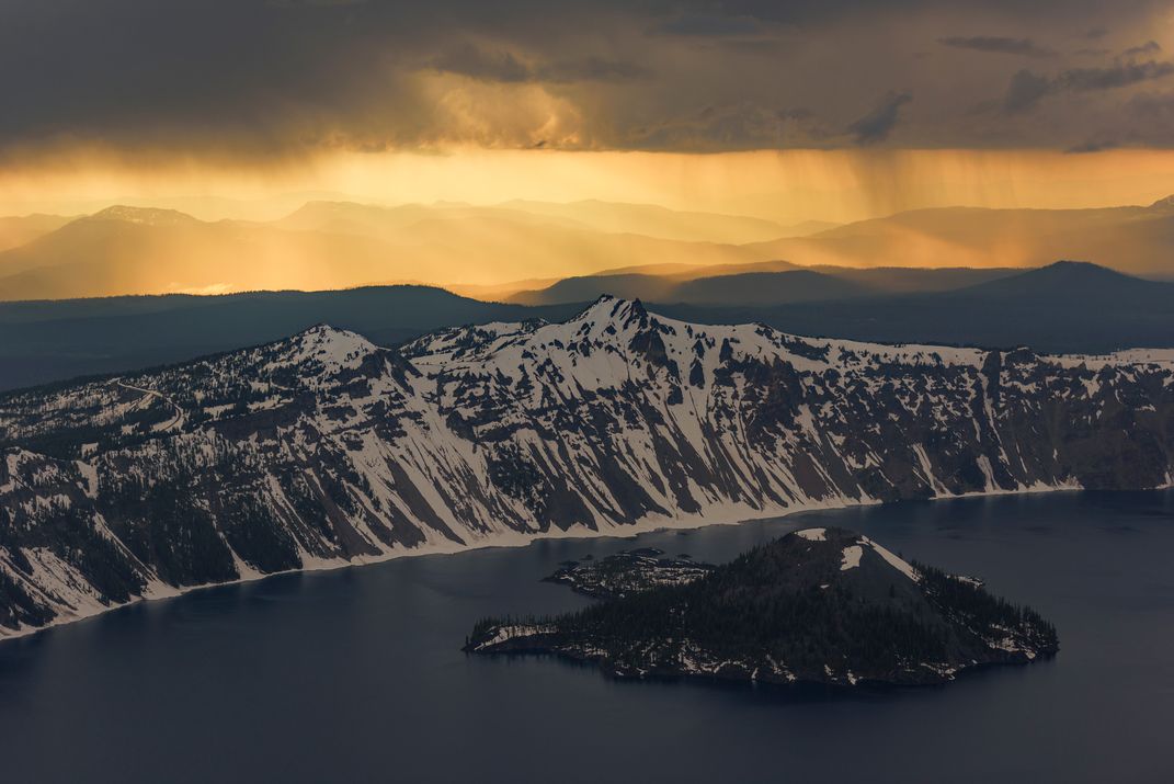 Wizard Island is a volcanic cinder cone which forms an island in Crater Lake, Oregon - the deepest lake in the US (1,943 feet). The impressive average depth of this volcanic lake is due to the nearly symmetrical 4K foot deep caldera formed 7K years ago during the violent eruptions and subsequent collapse of Mt. Mazama. Crater Lake has no streams flowing into or out of it. In the distance one can see rain showers during the golden hour. One of my most spiritual flights to date.