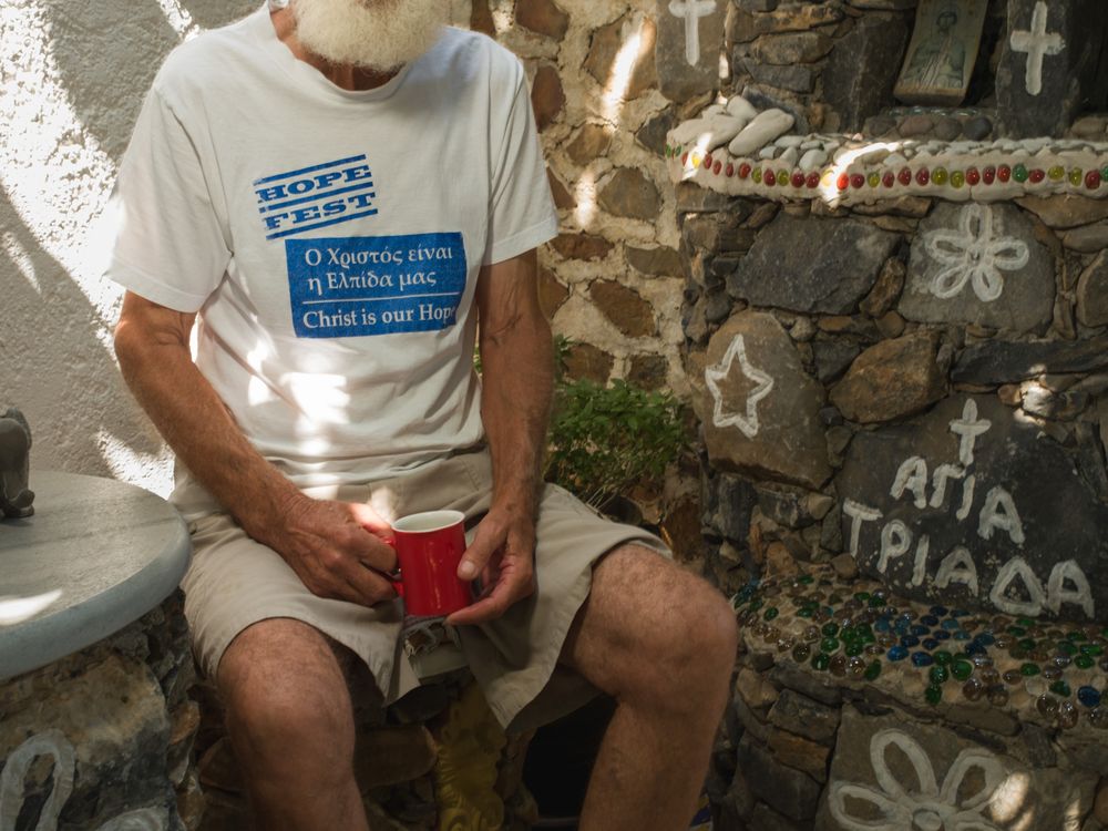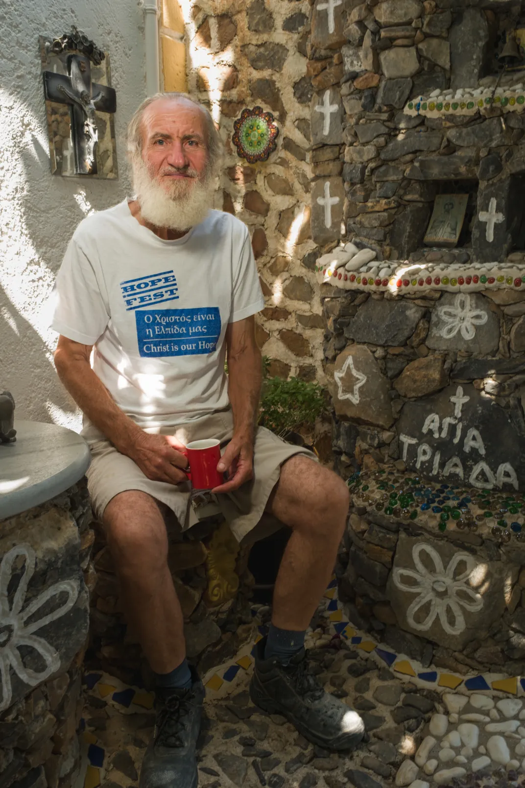 Evangelio is a stone artist living in Crete, Grece. He collect stones, rocks, ceramics, figurines, to build shrines in his backgarden to celebrate life over death, remembering the beloved ones, family members and pets. He open his private house to visitors welcoming everone with kindness and some tea. He is being doing this for many years after abandoned his hermit life.