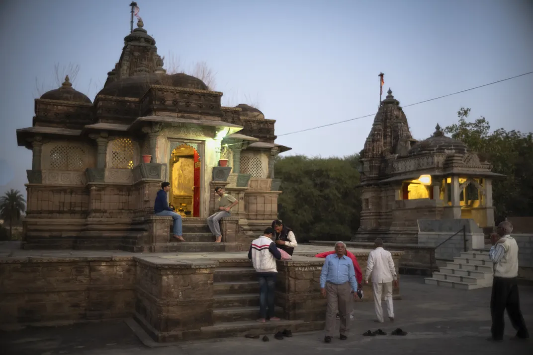 As the sun sets, worshipers gather at a small temple complex in Dungarpur, Rajasthan