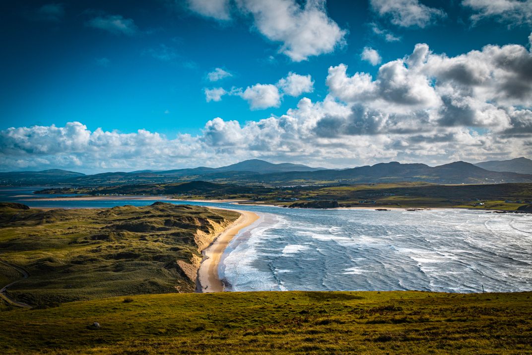 Evening-Donegal Beach. Today was a perfect day for landscape photos in Co. Donegal. We caught the late afternoon sun lighting up the beach below a semi-cloud-filled sky. The contrasting colors popped out, drawing the eye to the beach.