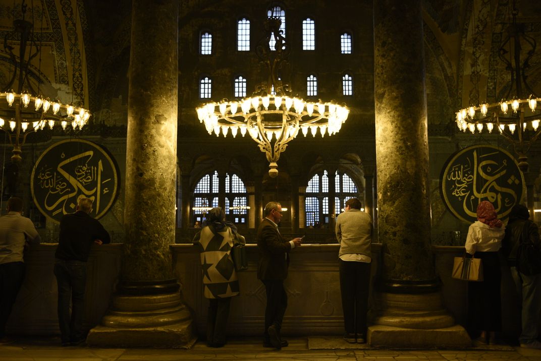 A quiet moment inside a historic mosque, where warm chandelier light meets centuries-old stone. Visitors pause in reflection, framed by towering columns and luminous windows, as evening settles gently into the sacred space.