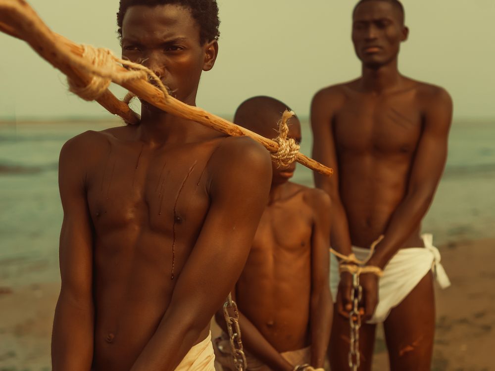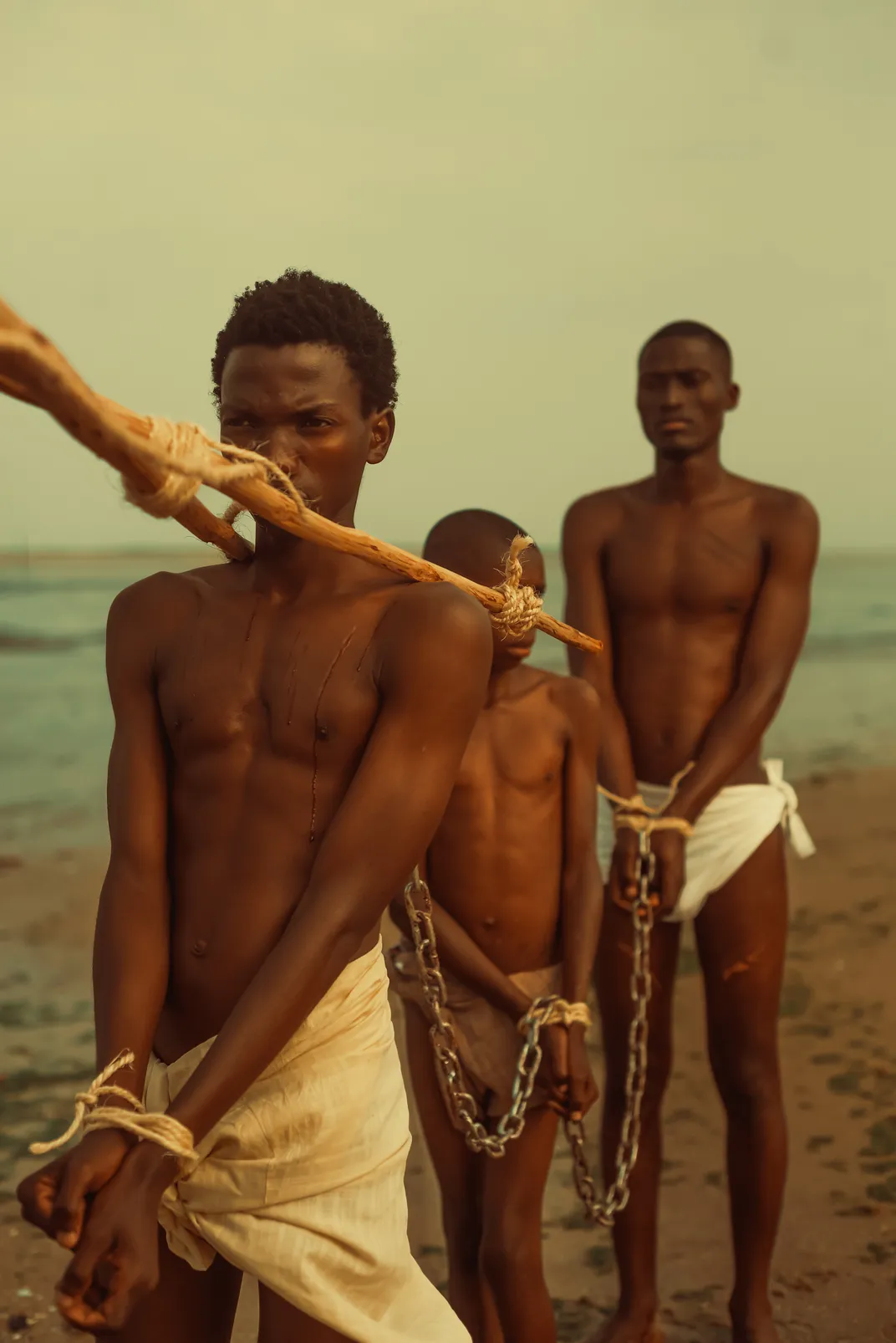 A symbolic reenactment of forced displacement along the African coast. Three bound figures walk a shoreline that witnessed untold suffering. The image honours resilience and memory, challenging the viewer to confront the legacies of captivity and the meaning of freedom.