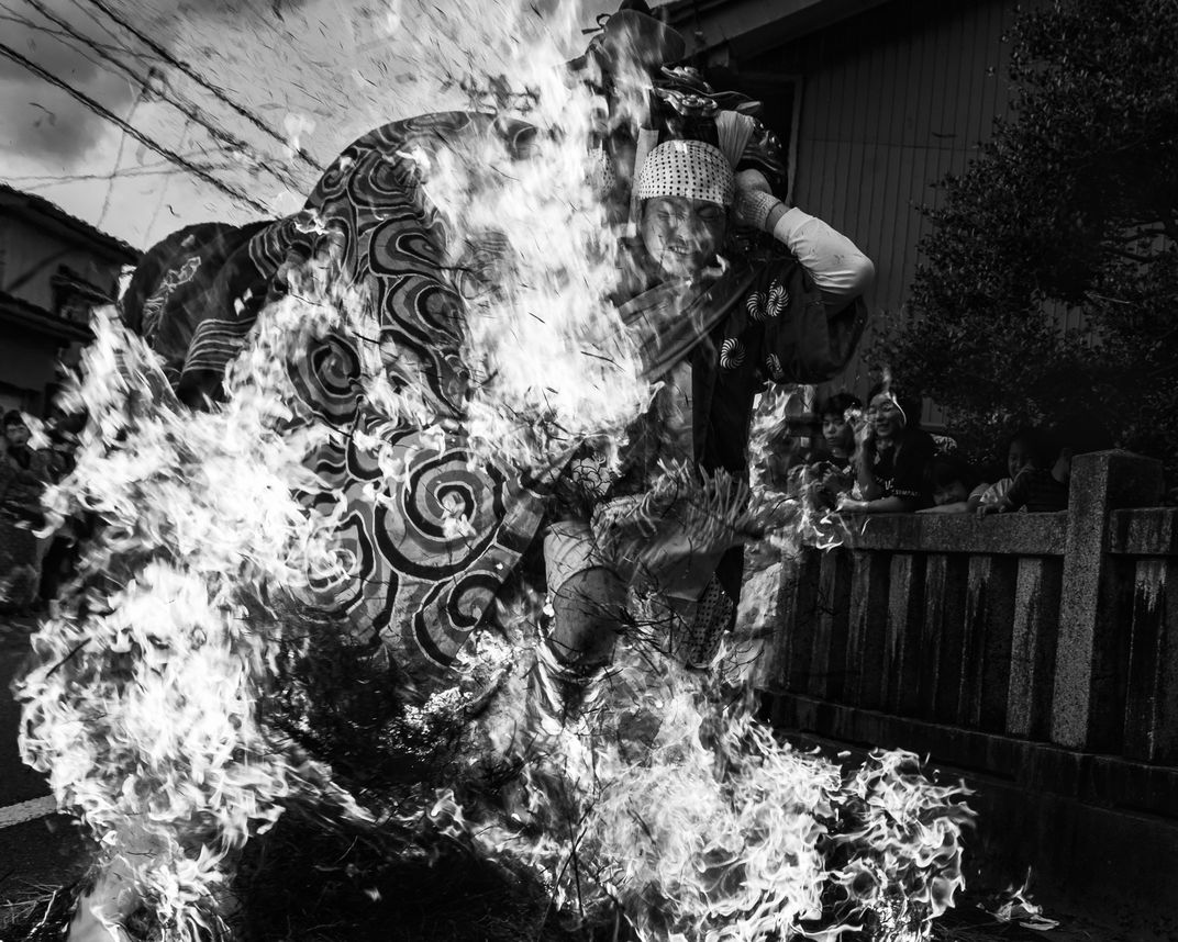 Toyama prefecture is famous as one of the foremost places in Japan for the lion dance (shishimai), a traditional performing art. Performers in lion costume dance to the traditional festival music of flutes, gongs and drums. A fire ritual is part of the annual festival held every autumn at Futakuchi Kumano Shrine in Imizu, Toyama prefecture. After visiting every household in the town, three lions and a mikoshi (portable shrine) run through fire, burning away, it is believed, people’s impurities and defilements. This ritual is done twice, first in the evening and then during the night. The highlight of the festival is the sight of the three lions and the mikoshi, and the bold men propelling them, hurtling around the shrine grounds and dashing into the flames, over two metres in height. Toyama prefecture shishimai is divided into two types: mukade (centipede, i.e. a hundred legs) and futaritachi (four-legs). As the name suggests, futaritachi is performed by two people. Mukade, on the other hand, is performed by three or more people, a style rare in Japan.