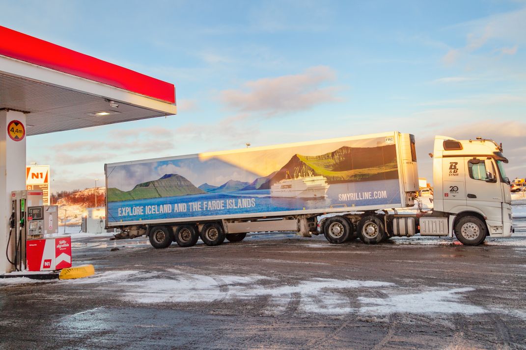 A photo of a truck at a gas station with an advertisement for a vacation cruise on its side that says "Explore Iceland".