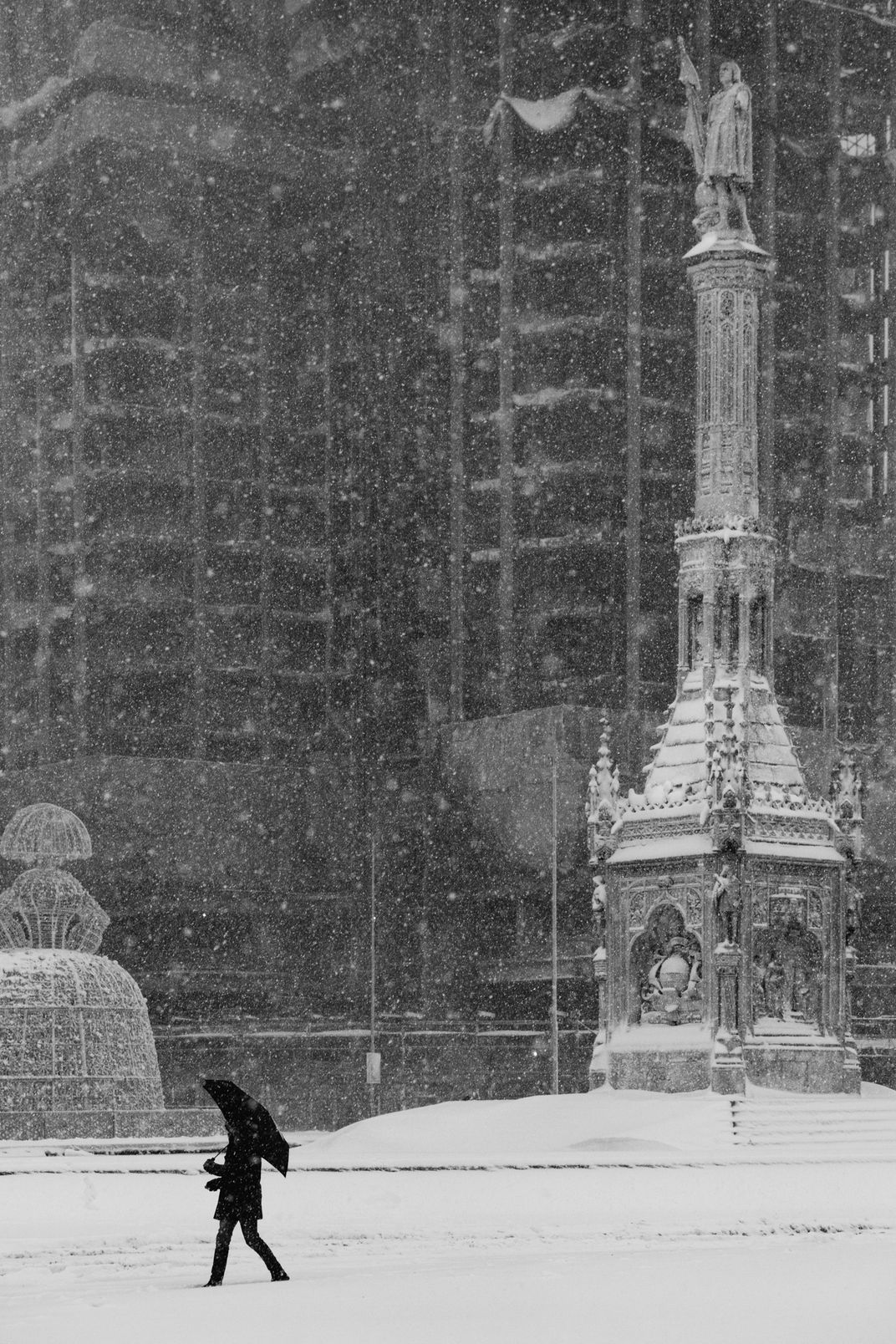 A person walks through a snow storm in Madrid - behind you can see statue of Cristobal Colón showing the way.