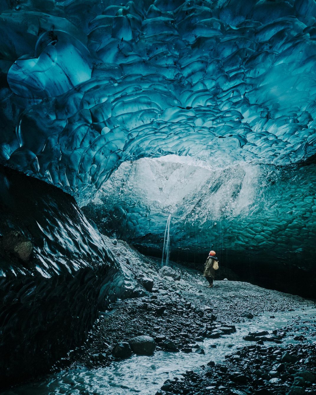 Exploring a naturally formed ice cave in Breiðamerkurjökull in Vatnajokull National Park in Iceland.