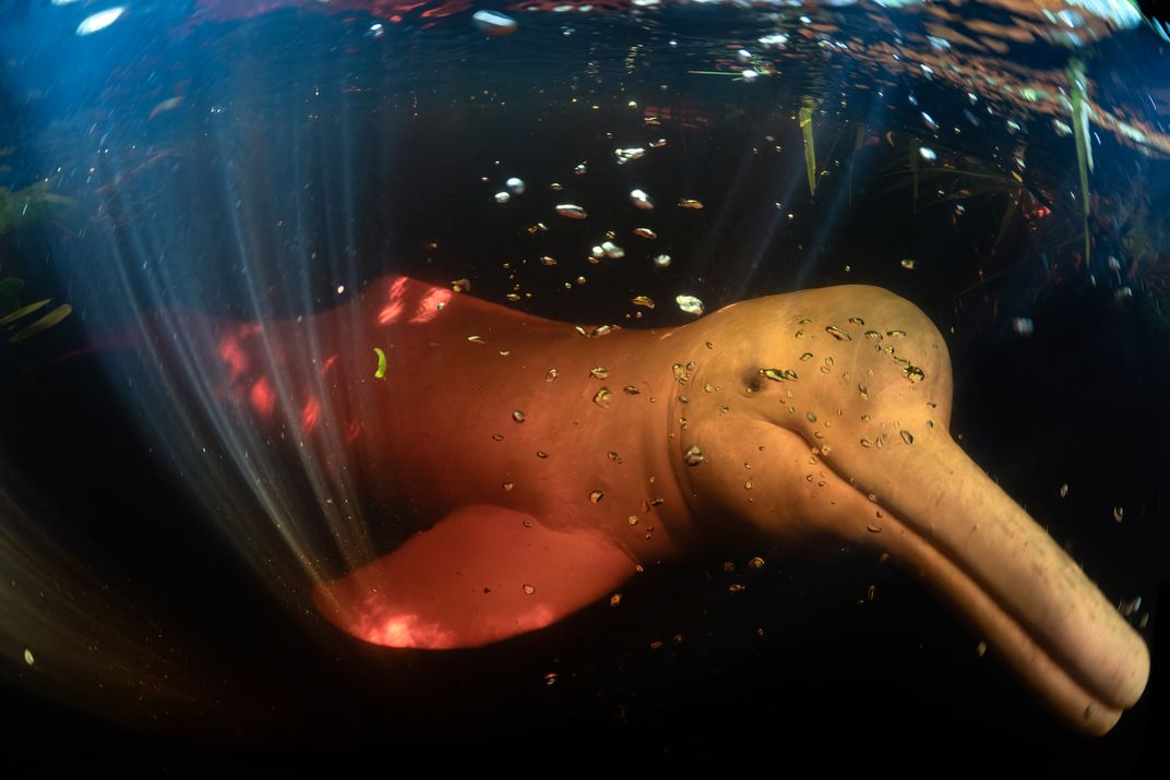 This photograph was made deep in the Brazilian Amazon on the Rio Negro, where the high-water season floods vast stretches of forest. Our wildlife photography expedition took us far upriver in search of the region’s unique species, but the unmistakable stars of the journey were the Amazon river dolphins—curious, slow-moving, and unlike any other dolphin on Earth. While diving in the tannin-rich ‘blackwater,’ one dolphin approached, illuminated by shafts of sunlight filtering through the surface. The copper-red glow you see is the natural light refracting through the dark water, revealing the dolphin’s distinctive form in this rare and intimate encounter.