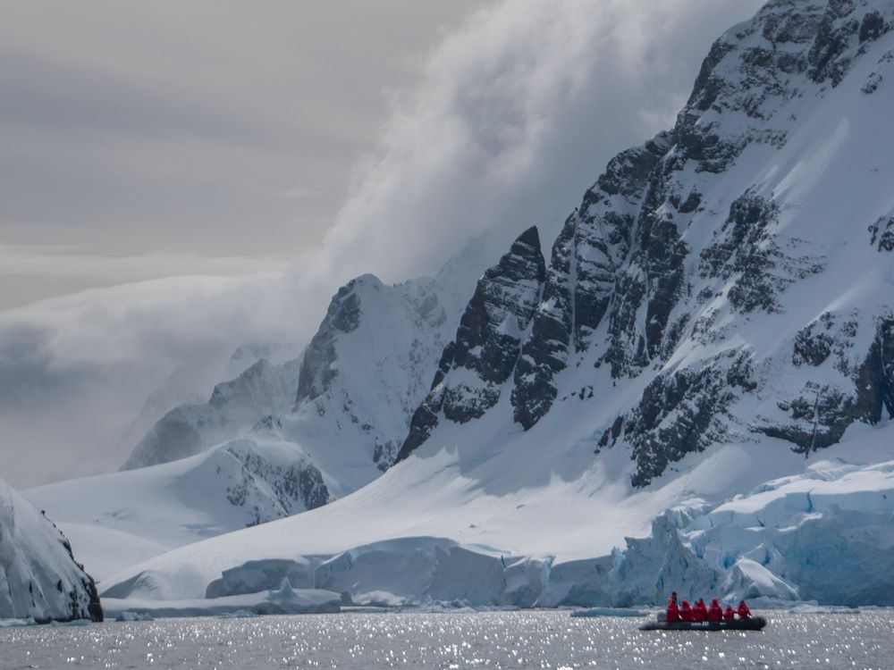 Exploring the Antarctic Peninsula, a zodiac full of adventures views the impressive landscape before them cautious of the approaching weather.