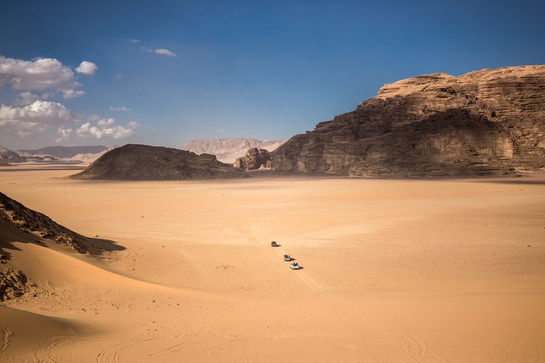 One of the best ways to explore the Wadi Rum desert is riding a Jeep and getting lost in its immensity.