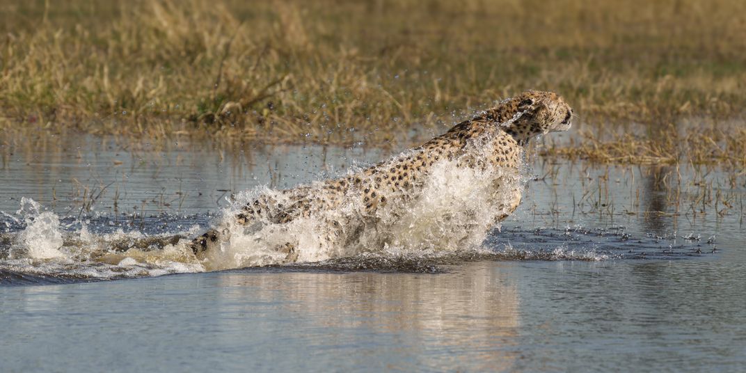As if shout of a cannon, an adult cheetah explodes from being completely submerged while crossing a channel in the Okavango Delta, Botswana. Cheetah are the most water-adverse of the big cats and she reminded me of an Olympic butterfly swimmer in full stroke.