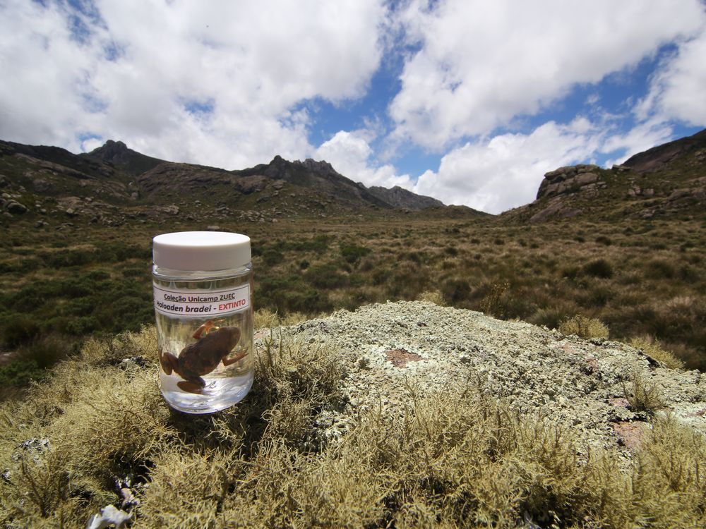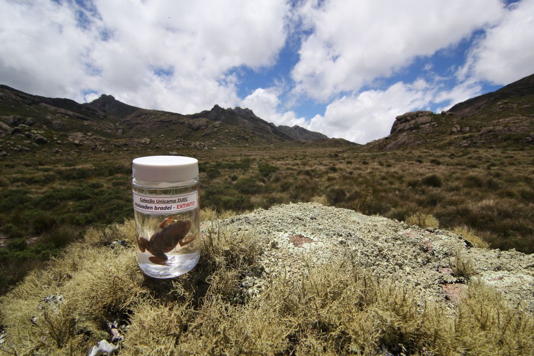 A specimen of the extinct frog Holoaden bradei, last seen in the wild in 1978, sits in what was once its natural habitat (Parque Nacional do Itatiaia; Brazil's first national park, State of Rio de Janeiro/Minas Gerais, Brazil). The culprit: a fungal pathogen that has decimated amphibian populations globally.