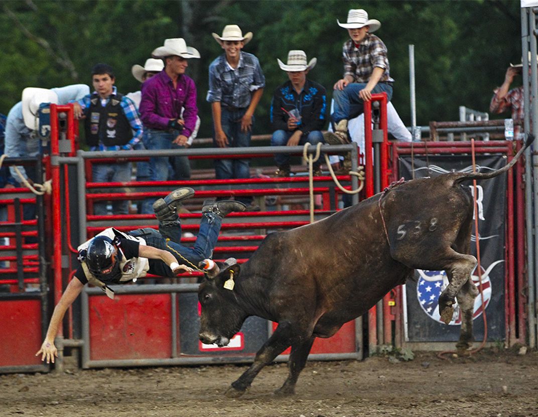 A Bull Riders try's to win some Bonus Money. As he dove in the air to get ahold of the rope an pull if off on a bull's ear to win the Bonus money. After winning the Jackpot in Bull Riding event Sat Jun 29, 2019. Ten other riders were in the ring running after it at the same time In Waynesville,Ohio at Fox Hollow Rodeo 4th of July event. As the Riders try to pull's off the rope to win $75 off the ear of the Bull. He was close