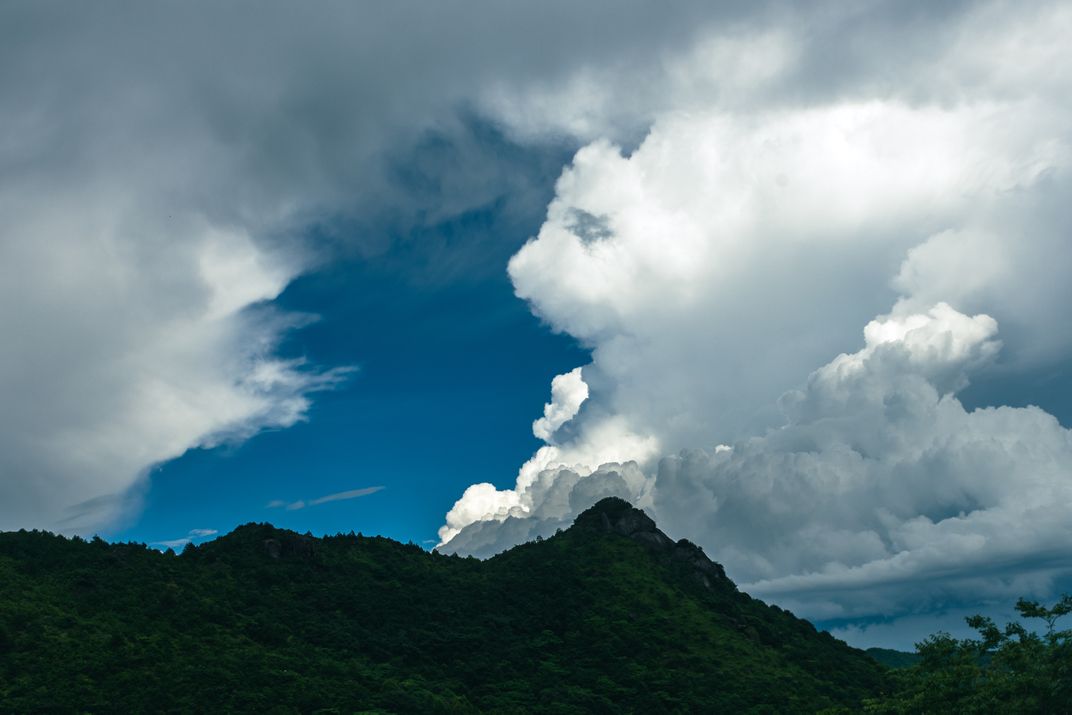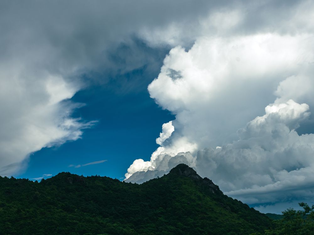 The clouds in the sky are like a beautiful angel waking up the sleeping giant. Taken on June 19, 2023 in Xunwu County, Ganzhou City, Jiangxi Province, China.