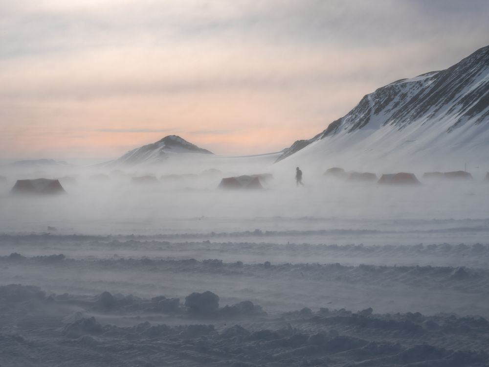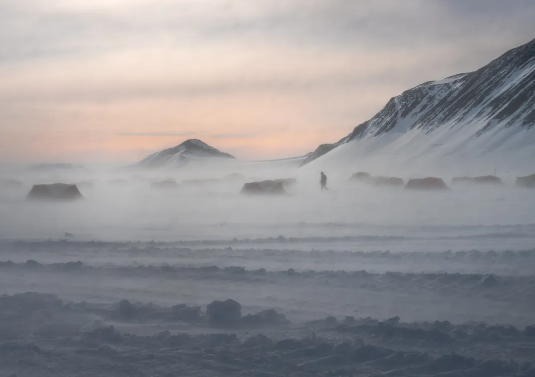 This image shows early morning at the base camp of Antarctica. One of the staff was struggling to walk towards to dining tent from his or her tent through the strong wind. The wind had blown the snow from the ground. It was a very harsh condition to work, super frozen cold and powerful wind as well as super dry! However, Antarctica working team, athletes, scientists, and tourists still gather here to explore the 7th continent.