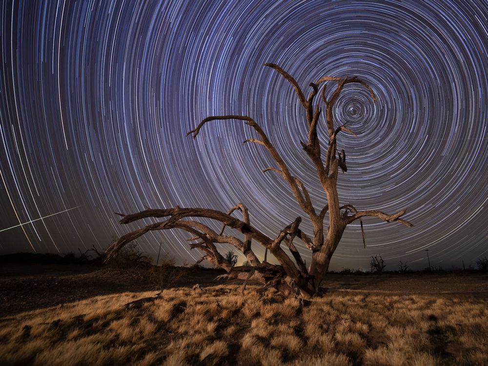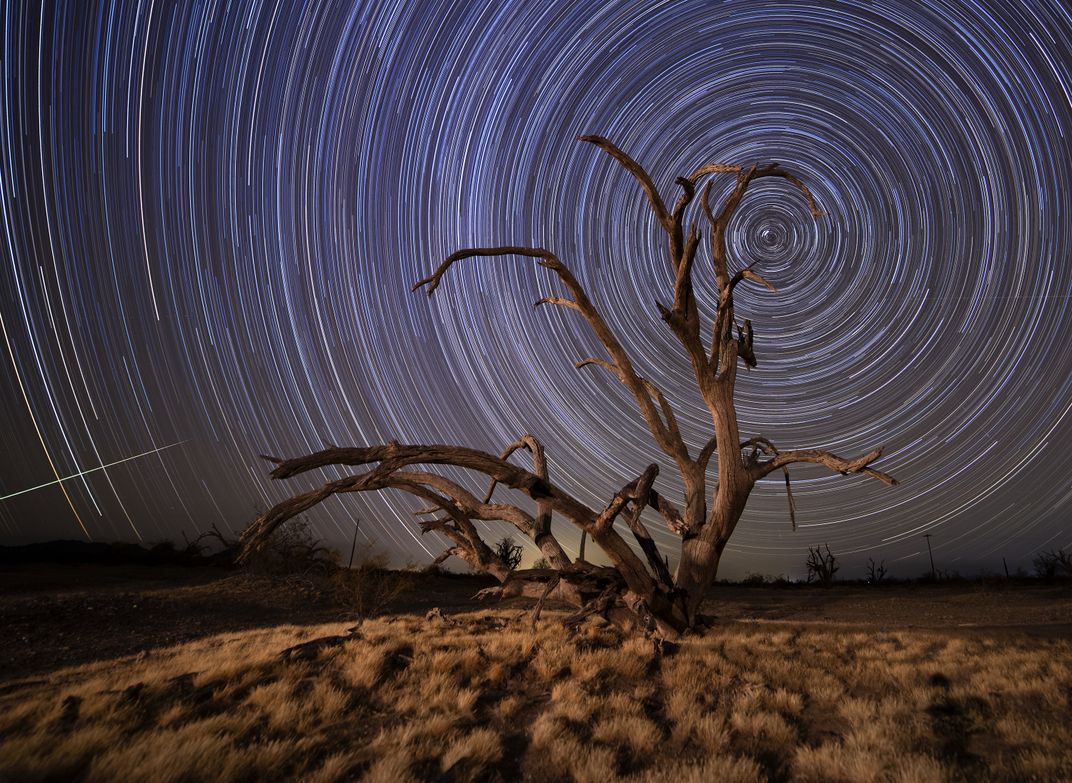 A star trail created in the California desert behind an ancient ironwood tree