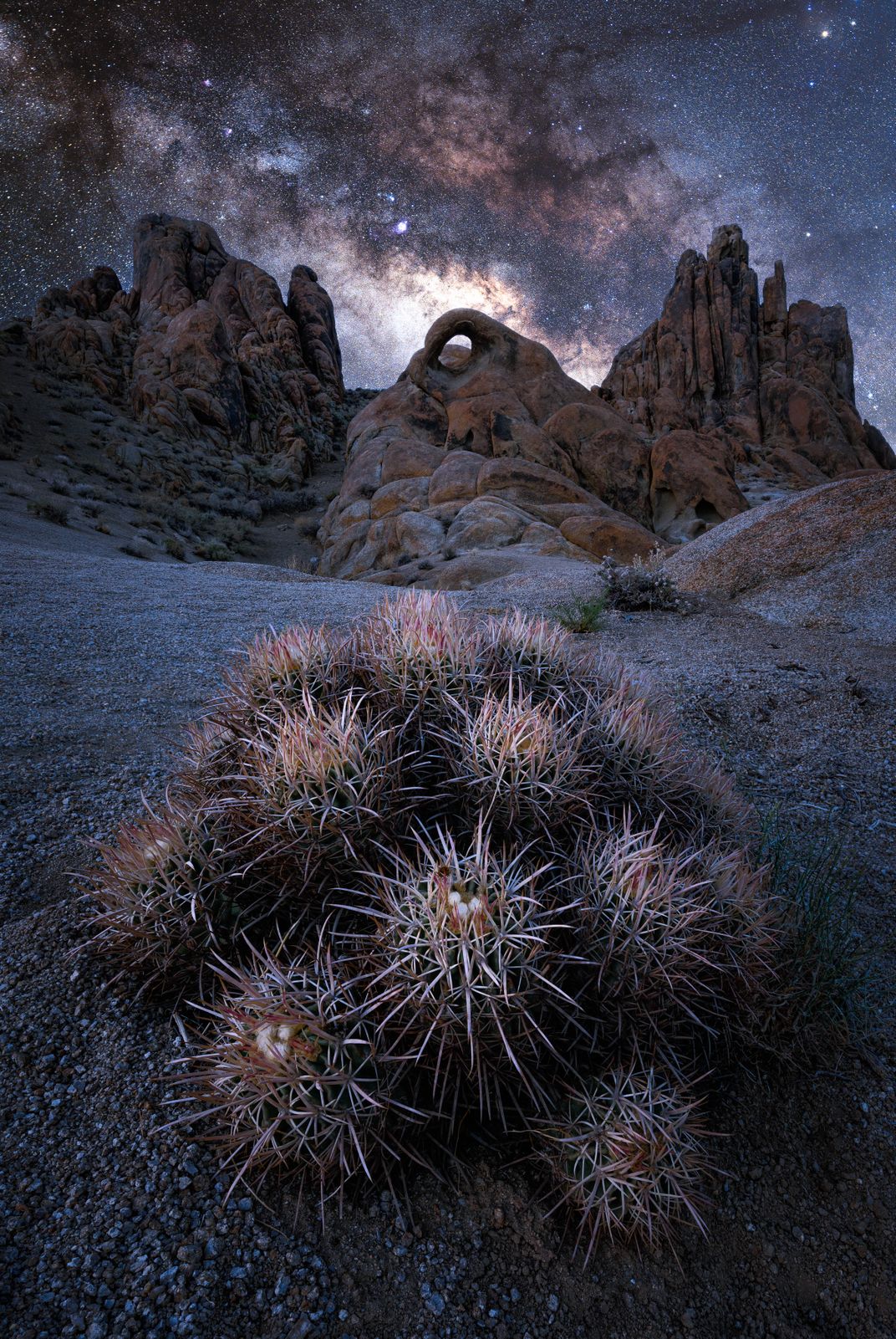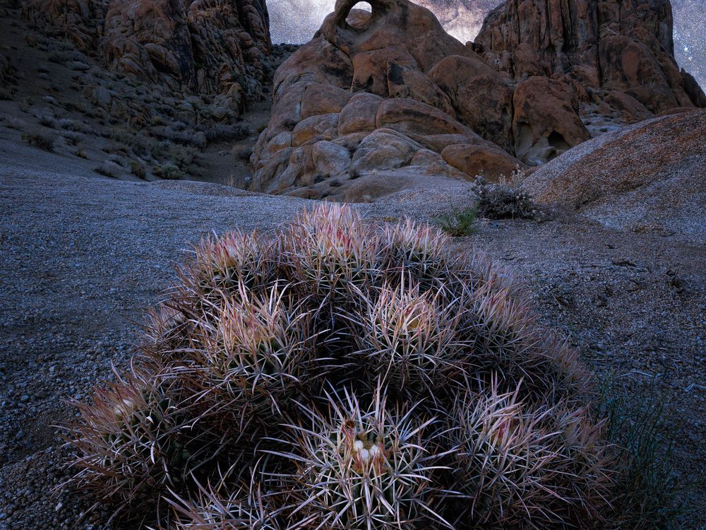 Barrel cactus speckle the alien landscape at California's Alabama Hills, making for wonderful foreground elements against the strange rock formations and incredible night skies.