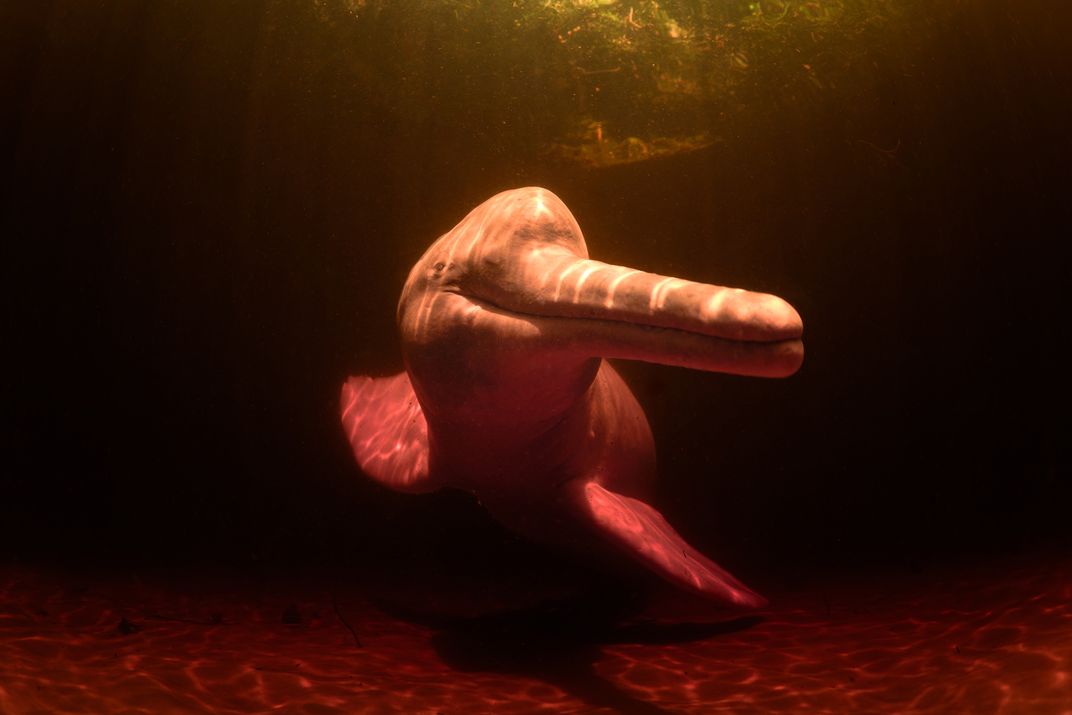 For this photograph, I dove down and settled on the bottom of the Rio Negro, where the normally exposed riverbank lay submerged under nearly five feet of high-water flood. As I sat quietly on the silty floor, a curious Amazon river dolphin drifted toward me, seemingly just as interested in me as I was in it. We hovered there together in the tannin-dark water, studying one another in a rare moment of shared curiosity. Capturing this interaction in a place that is usually dry land—and with such a naturally inquisitive animal—made the encounter unforgettable.