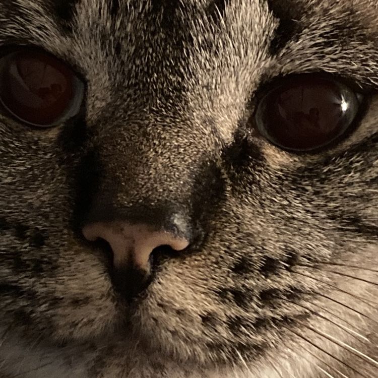 I was laying in a bed with my cat Gracie, a man and his cat. She is comfortable with her family.