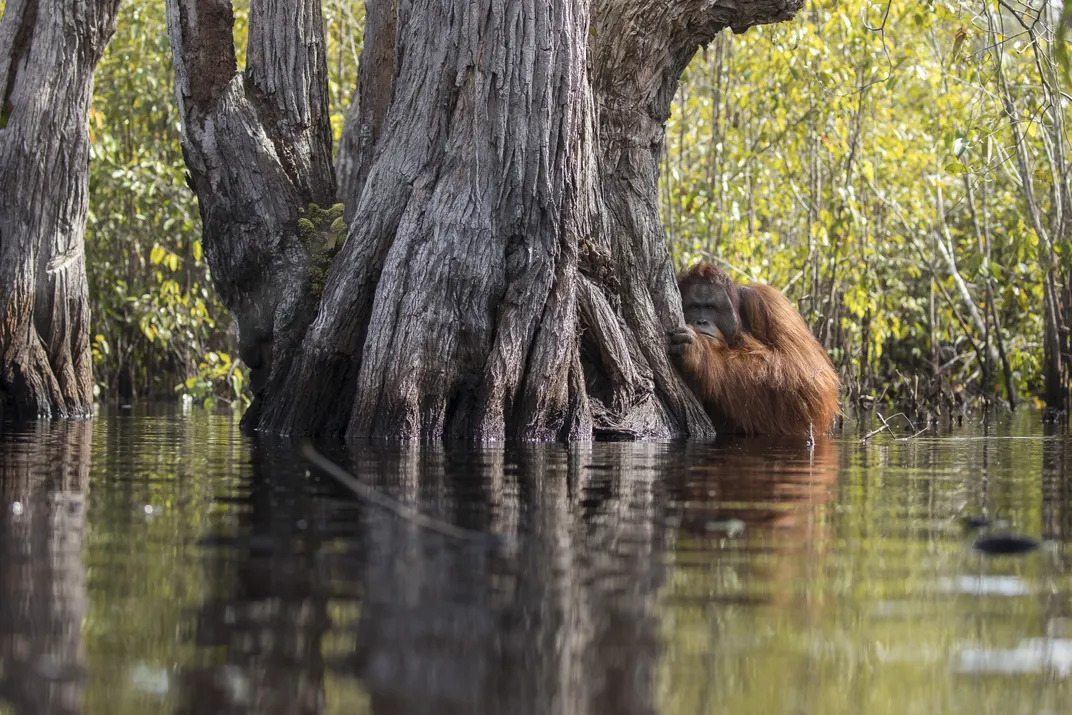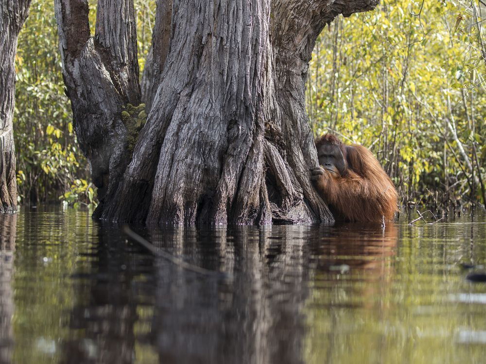 Face to face with this wild Orangutan in a river in Borneo, Indonesia, Its a natural history moment since its very unnatural and against their instincts to enter a river. This huge male was crossing a river.